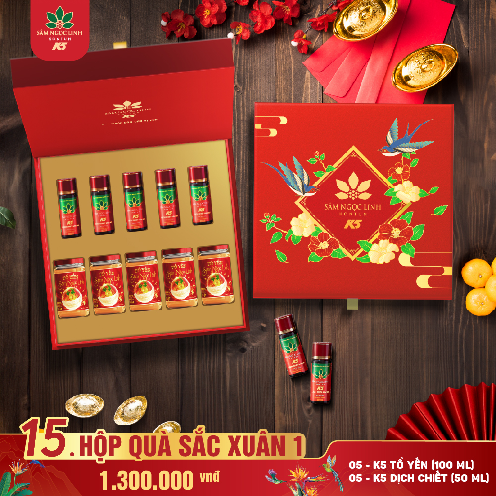 Hộp Quà Sắc Xuân 1 là món quà Tết cao cấp, mang thông điệp "sức khỏe là phúc – an khang là lộc", kết hợp hai tinh phẩm quý từ sâm Ngọc Linh và tổ yến – những đặc sản thượng hạng của Việt Nam. Mỗi sản phẩm được tuyển chọn kỹ lưỡng, đóng gói tinh tế, là món quà đầu năm thể hiện sự trân quý và tinh tế, gửi gắm lời chúc sức khỏe dồi dào và năm mới rực rỡ.