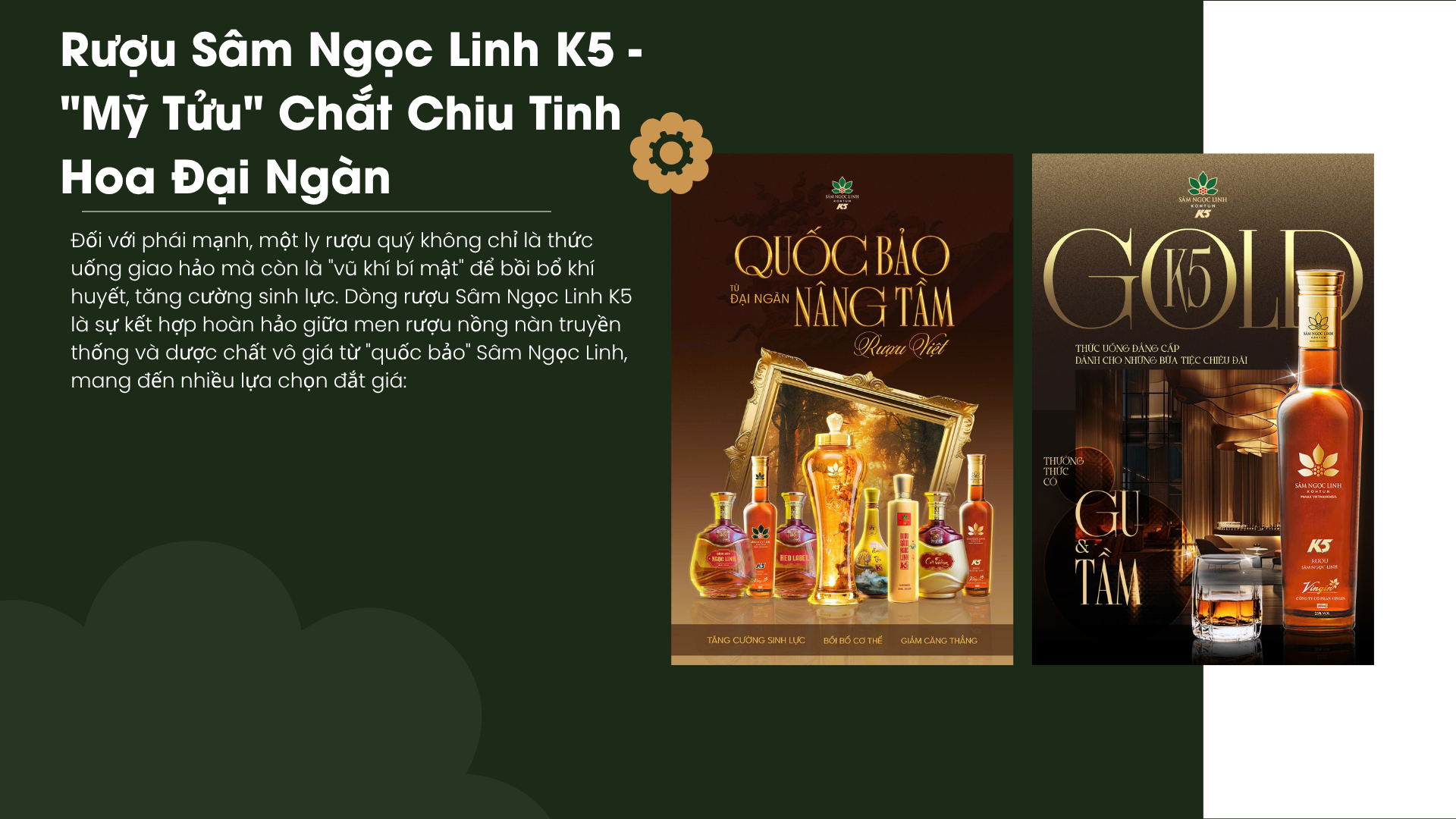 Tìm hiểu chi tiết về rượu sâm dây Ngọc Linh K5 – sản phẩm nổi bật giúp tăng cường sinh lực, bồi bổ sức khỏe, giảm mệt mỏi. Hướng dẫn cách sử dụng và lưu ý khi dùng.