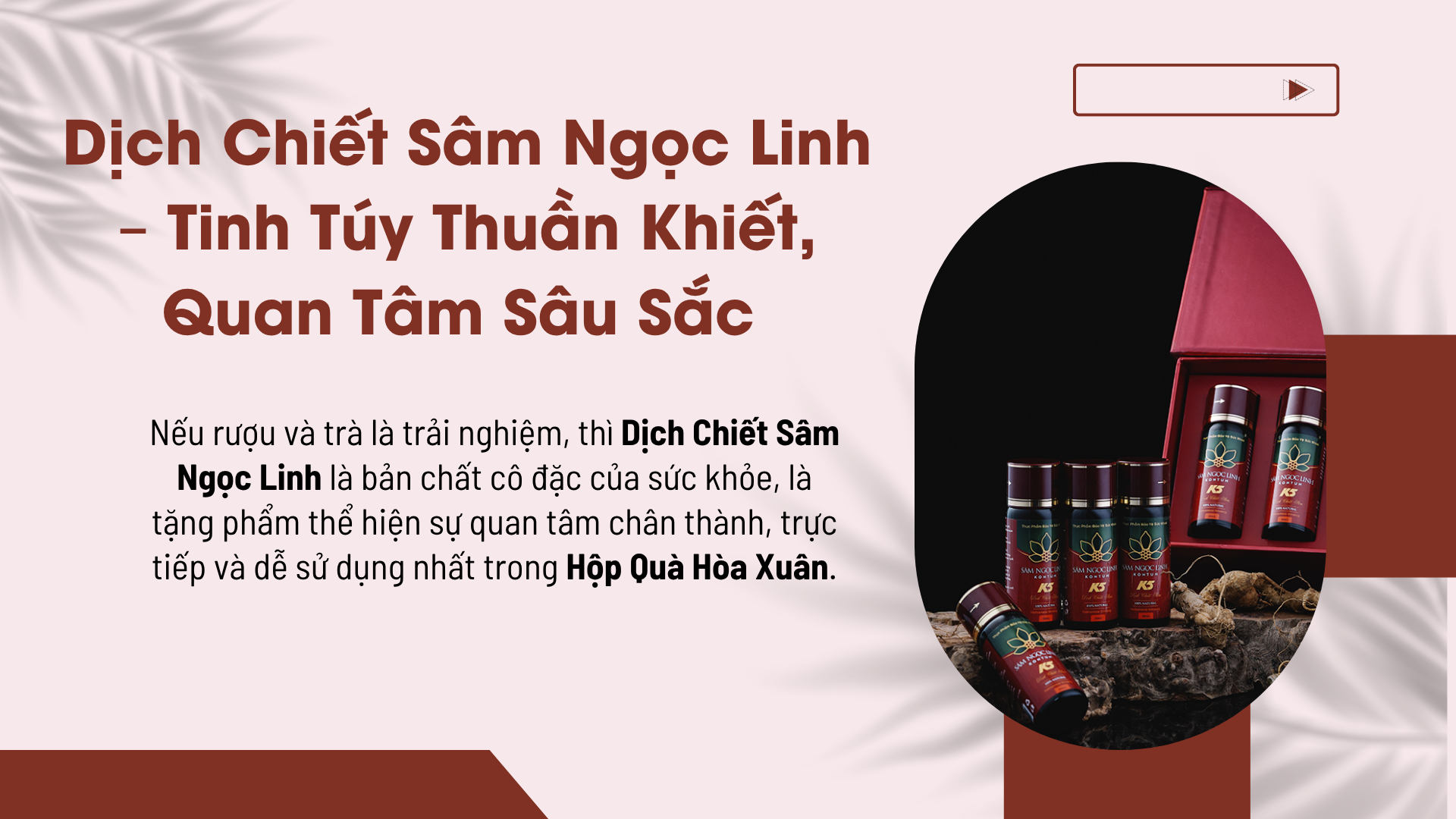 Nếu rượu và trà là trải nghiệm, thì Dịch Chiết Sâm Ngọc Linh là bản chất cô đặc của sức khỏe, là tặng phẩm thể hiện sự quan tâm chân thành, trực tiếp và dễ sử dụng nhất trong Hộp Quà Hòa Xuân.