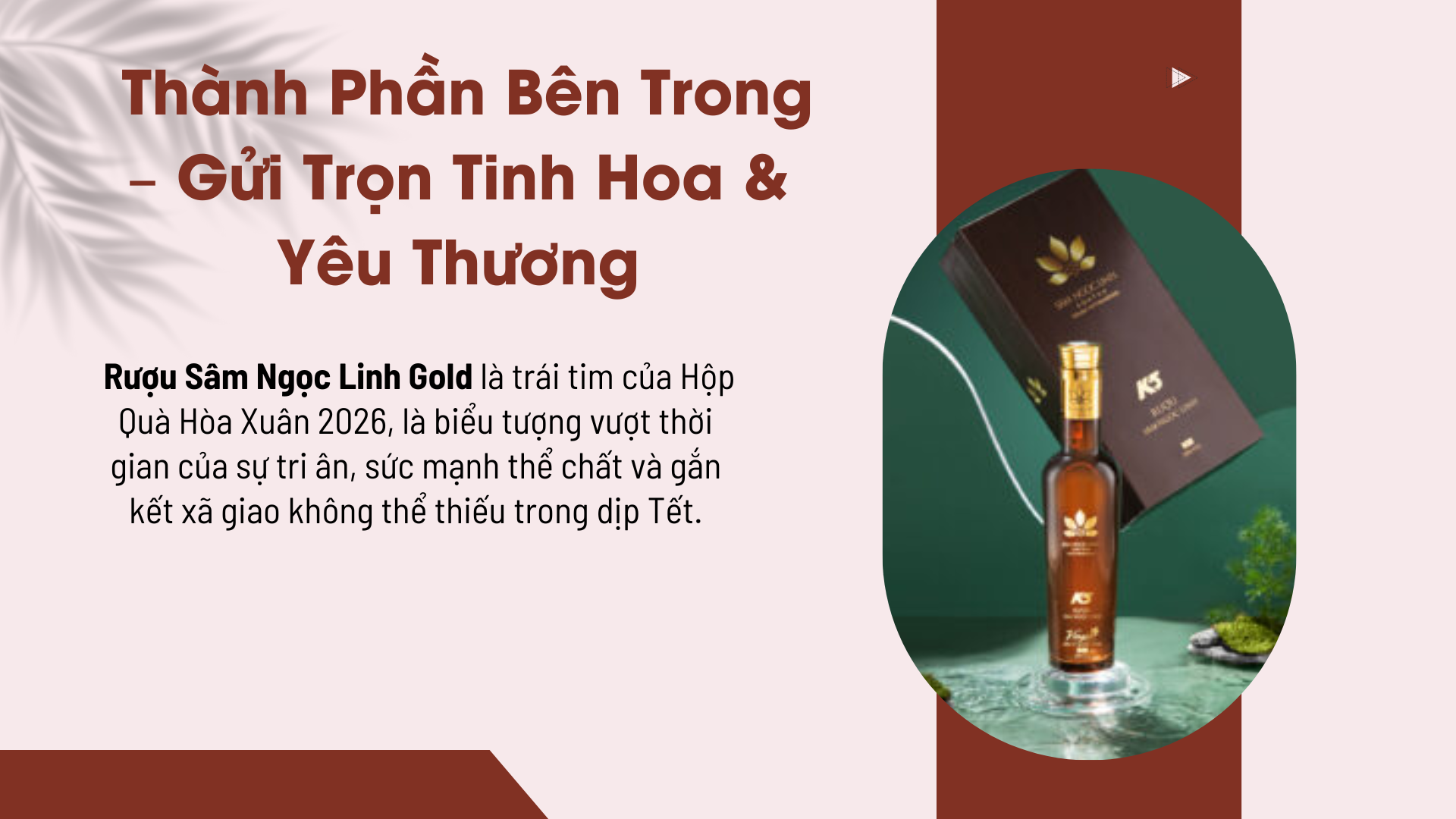 Rượu Sâm Ngọc Linh Gold là trái tim của Hộp Quà Hòa Xuân 2026, là biểu tượng vượt thời gian của sự tri ân, sức mạnh thể chất và gắn kết xã giao không thể thiếu trong dịp Tết.