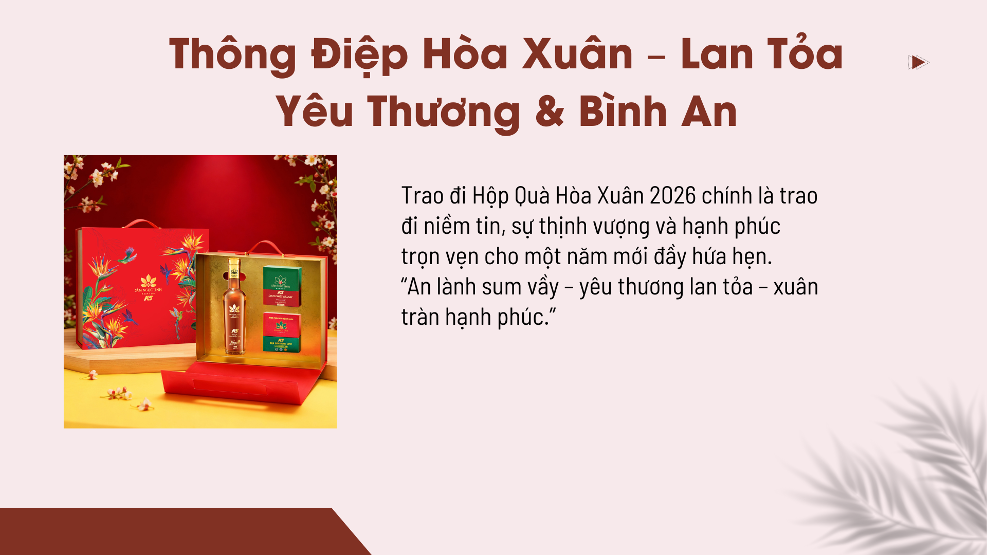 Thông điệp: “Nâng ly Hòa Xuân – Trao yêu thương, gửi phúc lộc. Chúc cả năm sung túc, mạnh khỏe, an khang.”