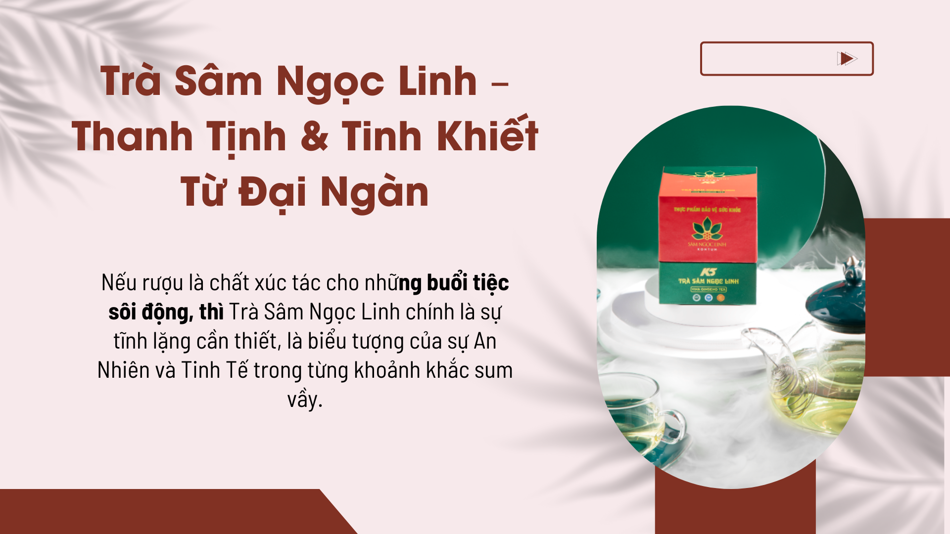 Nếu rượu là chất xúc tác cho những buổi tiệc sôi động, thì Trà Sâm Ngọc Linh chính là sự tĩnh lặng cần thiết, là biểu tượng của sự An Nhiên và Tinh Tế trong từng khoảnh khắc sum vầy.
