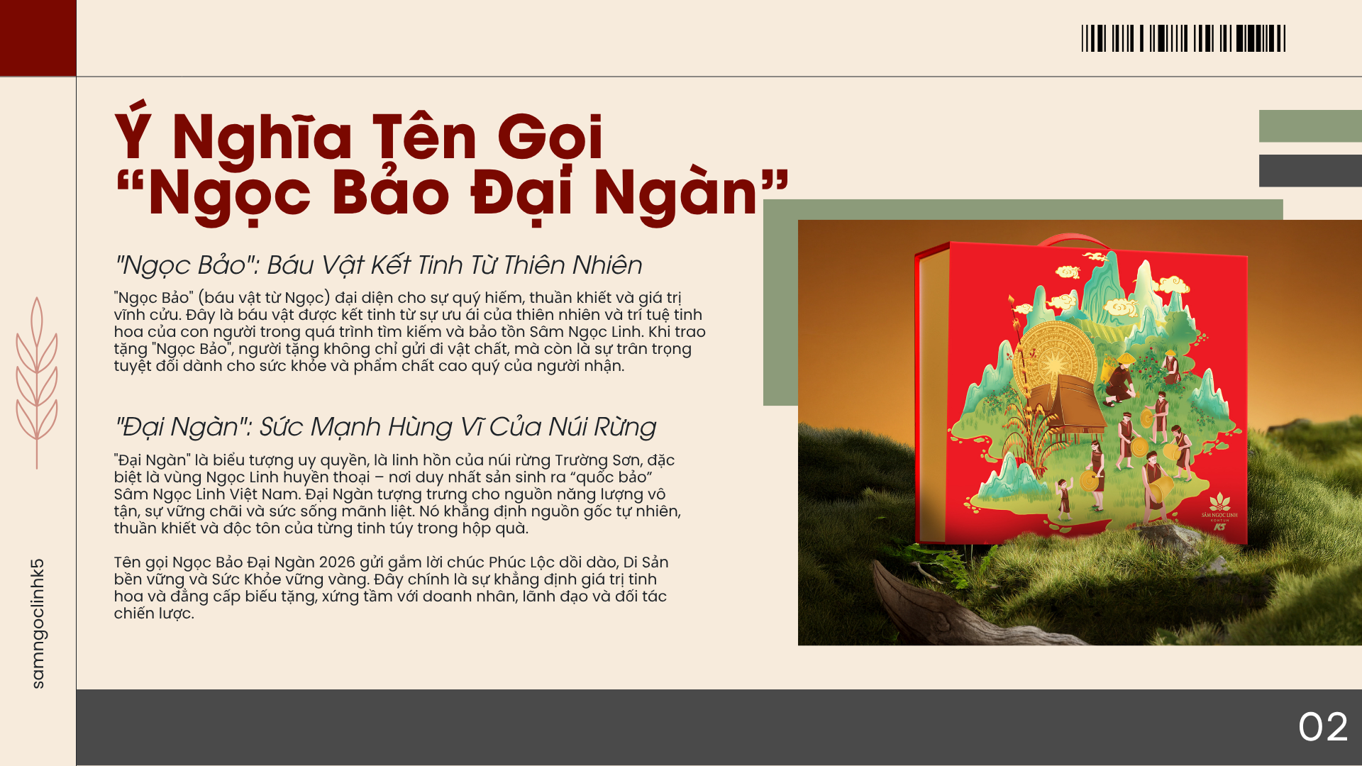 "Đại Ngàn" là biểu tượng uy quyền, là linh hồn của núi rừng Trường Sơn, đặc biệt là vùng Ngọc Linh huyền thoại – nơi duy nhất sản sinh ra “quốc bảo” Sâm Ngọc Linh Việt Nam. Đại Ngàn tượng trưng cho nguồn năng lượng vô tận, sự vững chãi và sức sống mãnh liệt. Nó khẳng định nguồn gốc tự nhiên, thuần khiết và độc tôn của từng tinh túy trong hộp quà.