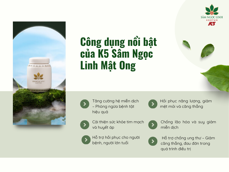 Khám phá công dụng vượt trội của K5 Sâm Ngọc Linh Mật Ong: Tăng sức đề kháng, hỗ trợ giảm mệt mỏi, bồi bổ sức khỏe. Lựa chọn vàng cho người hiện đại.