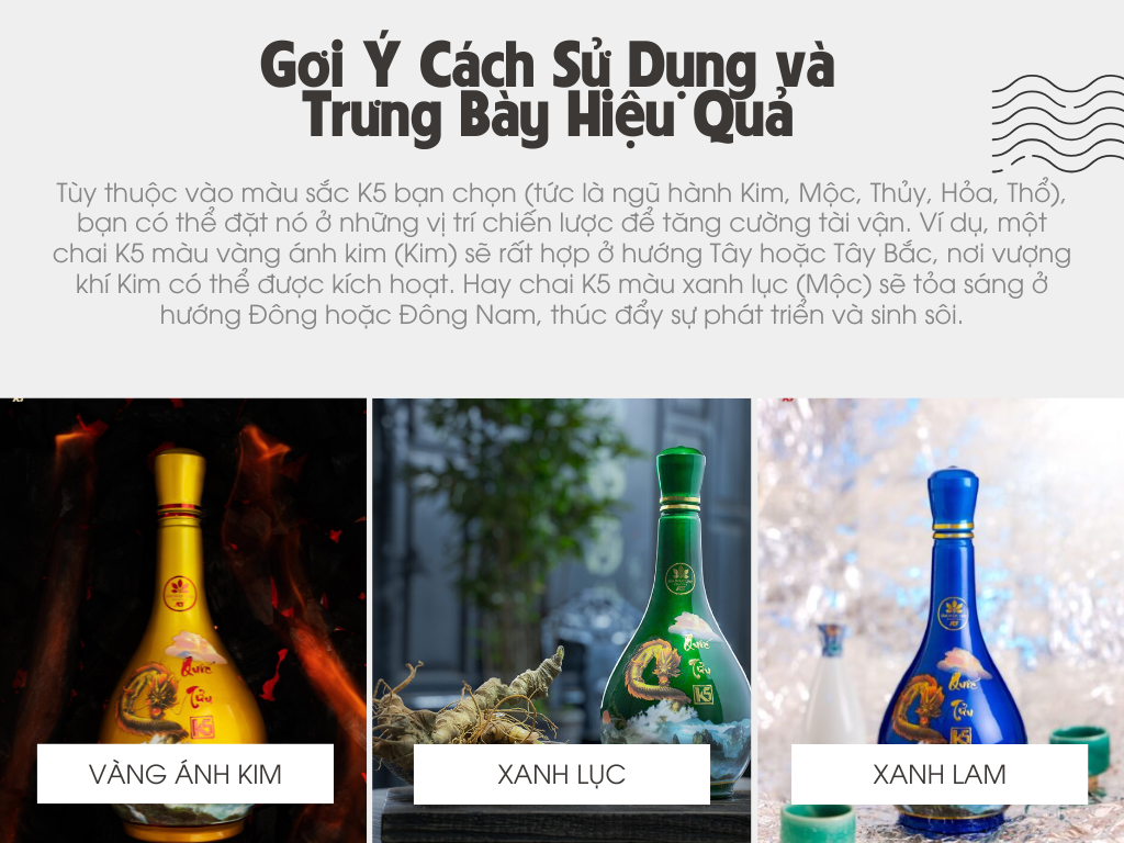 Hay chai K5 màu xanh lục (Mộc) sẽ tỏa sáng ở hướng Đông hoặc Đông Nam, thúc đẩy sự phát triển và sinh sôi. Việc đặt K5 đúng chỗ không chỉ là một nghệ thuật mà còn là một cách để cân bằng năng lượng, giúp mọi việc hanh thông hơn.