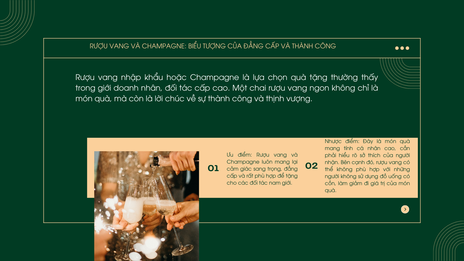 Ưu điểm: Rượu vang và Champagne luôn mang lại cảm giác sang trọng, đẳng cấp và rất phù hợp để tặng cho các đối tác nam giới.
