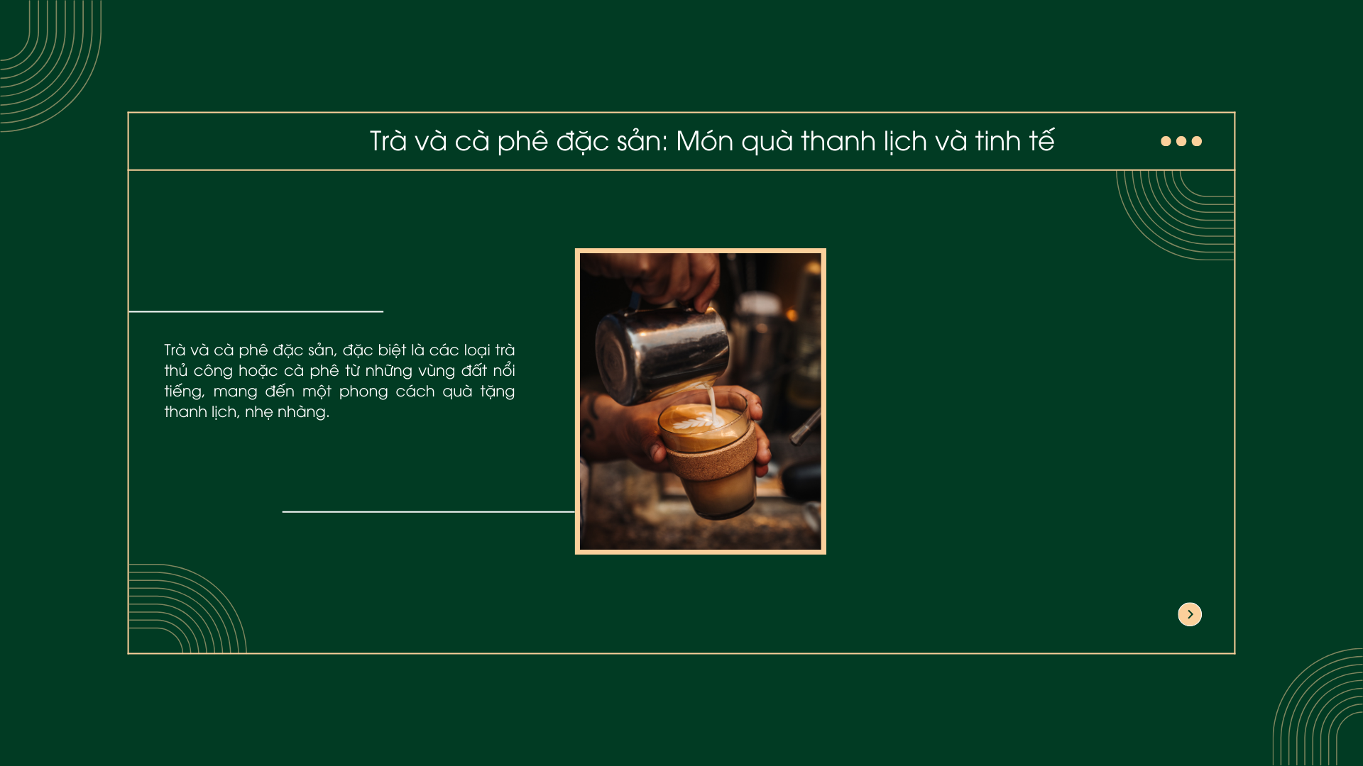 Trà và cà phê đặc sản, đặc biệt là các loại trà thủ công hoặc cà phê từ những vùng đất nổi tiếng, mang đến một phong cách quà tặng thanh lịch, nhẹ nhàng.