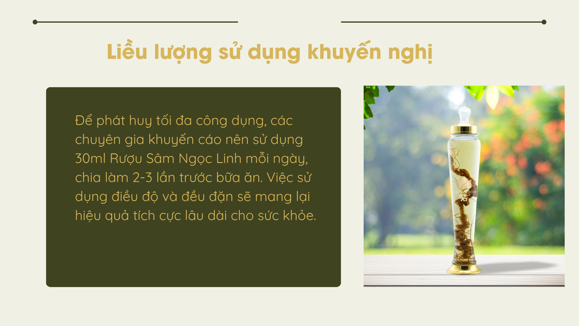 Để phát huy tối đa công dụng, các chuyên gia khuyến cáo nên sử dụng 30ml Rượu Sâm Ngọc Linh mỗi ngày, chia làm 2-3 lần trước bữa ăn. Việc sử dụng điều độ và đều đặn sẽ mang lại hiệu quả tích cực lâu dài cho sức khỏe.
