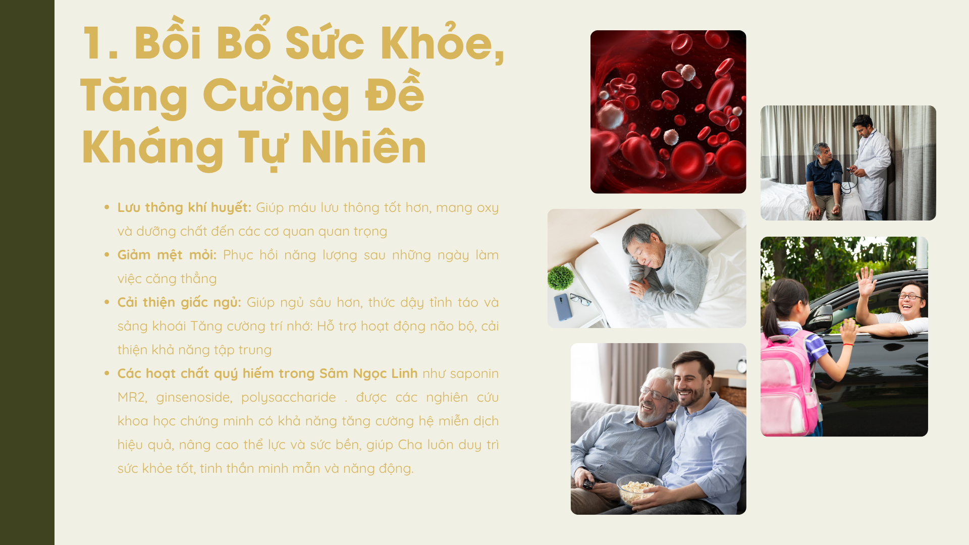 Các hoạt chất quý hiếm trong Sâm Ngọc Linh như saponin MR2, ginsenoside, polysaccharide . được các nghiên cứu khoa học chứng minh có khả năng tăng cường hệ miễn dịch hiệu quả, nâng cao thể lực và sức bền, giúp Cha luôn duy trì sức khỏe tốt, tinh thần minh mẫn và năng động.