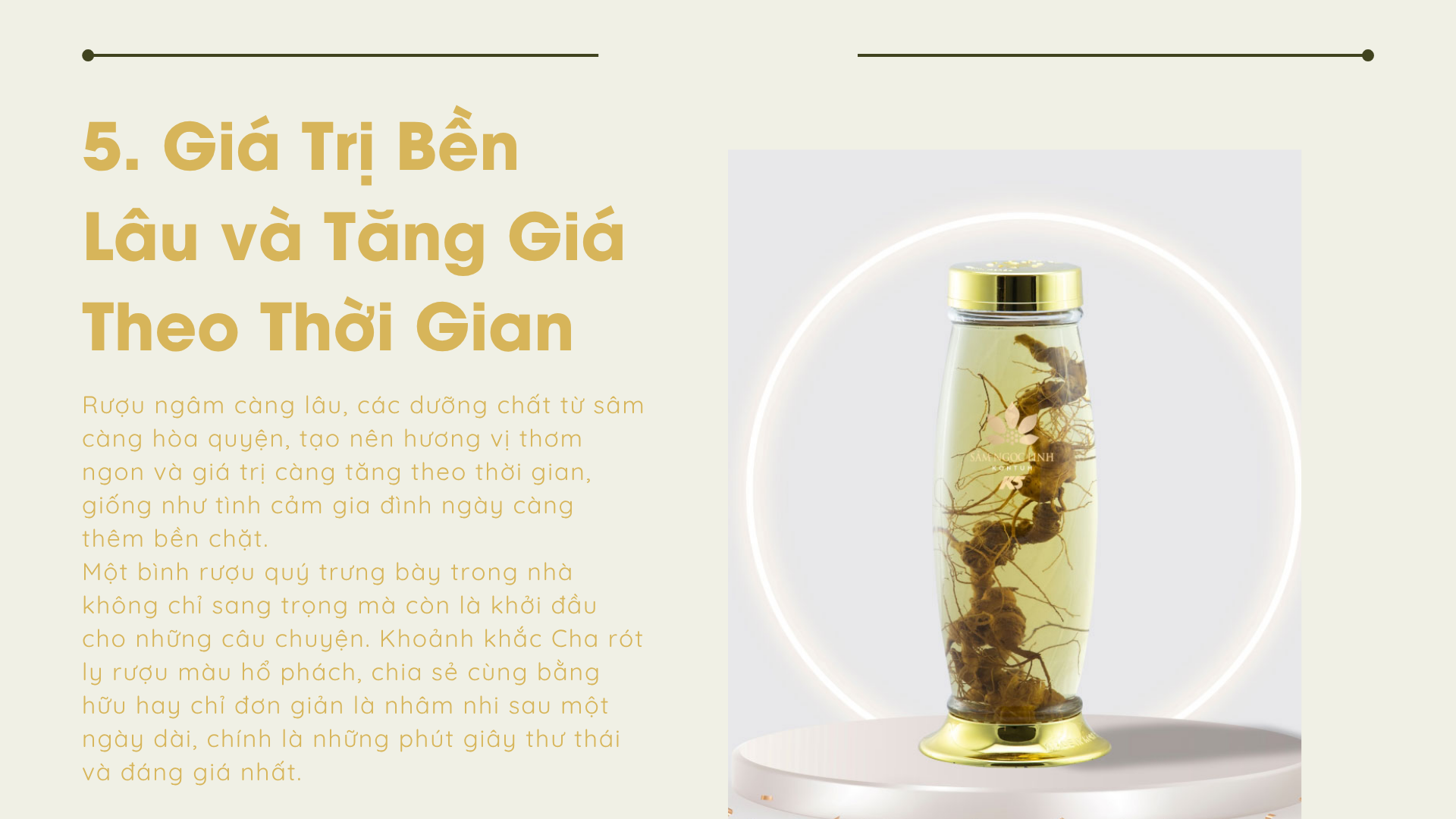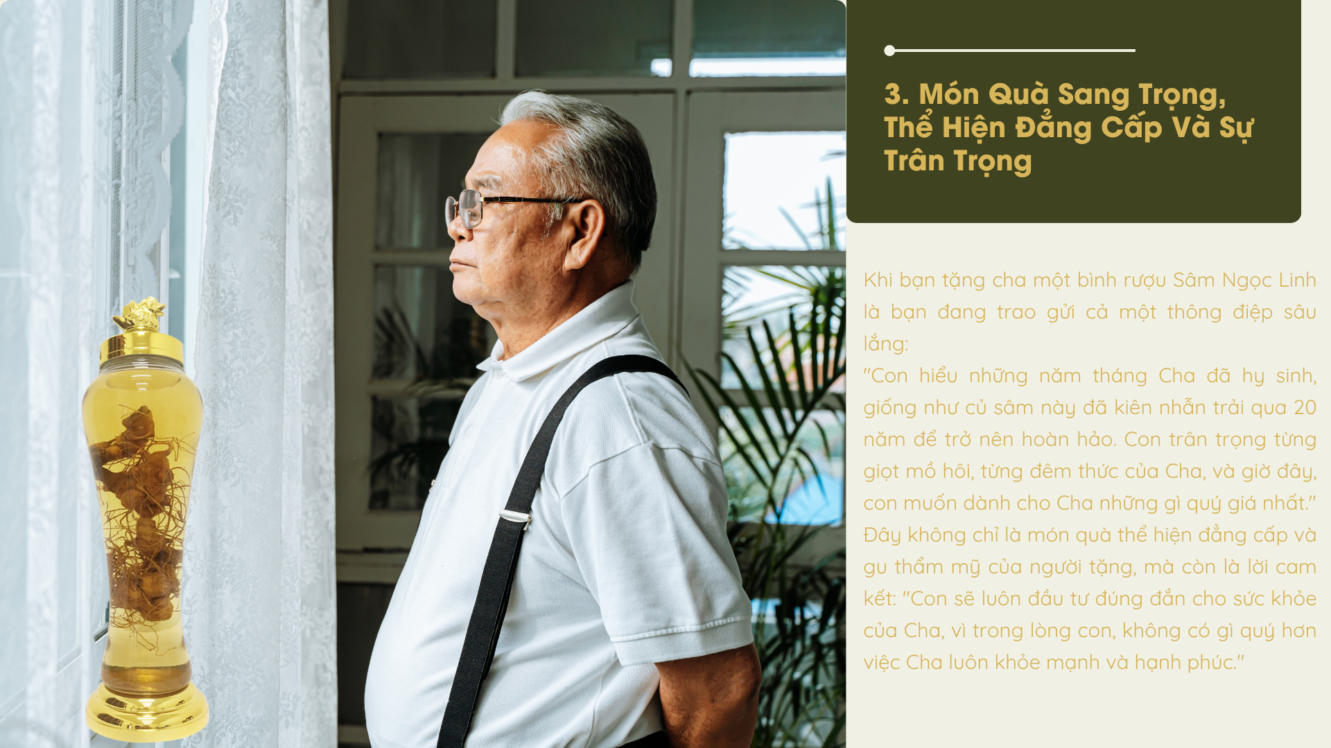 Đó không chỉ là vị ngọt thanh của sâm hay hương thơm đặc trưng của thảo dược quý, mà là sự quan tâm tinh tế mà con đã dành tặng. Trong từng giọt rượu ấy, Cha cảm nhận được những đêm con thức trắng suy nghĩ, những lần con lặng lẽ tìm hiểu về sức khỏe của Cha, chỉ vì muốn tìm ra món quà hoàn hảo nhất.
