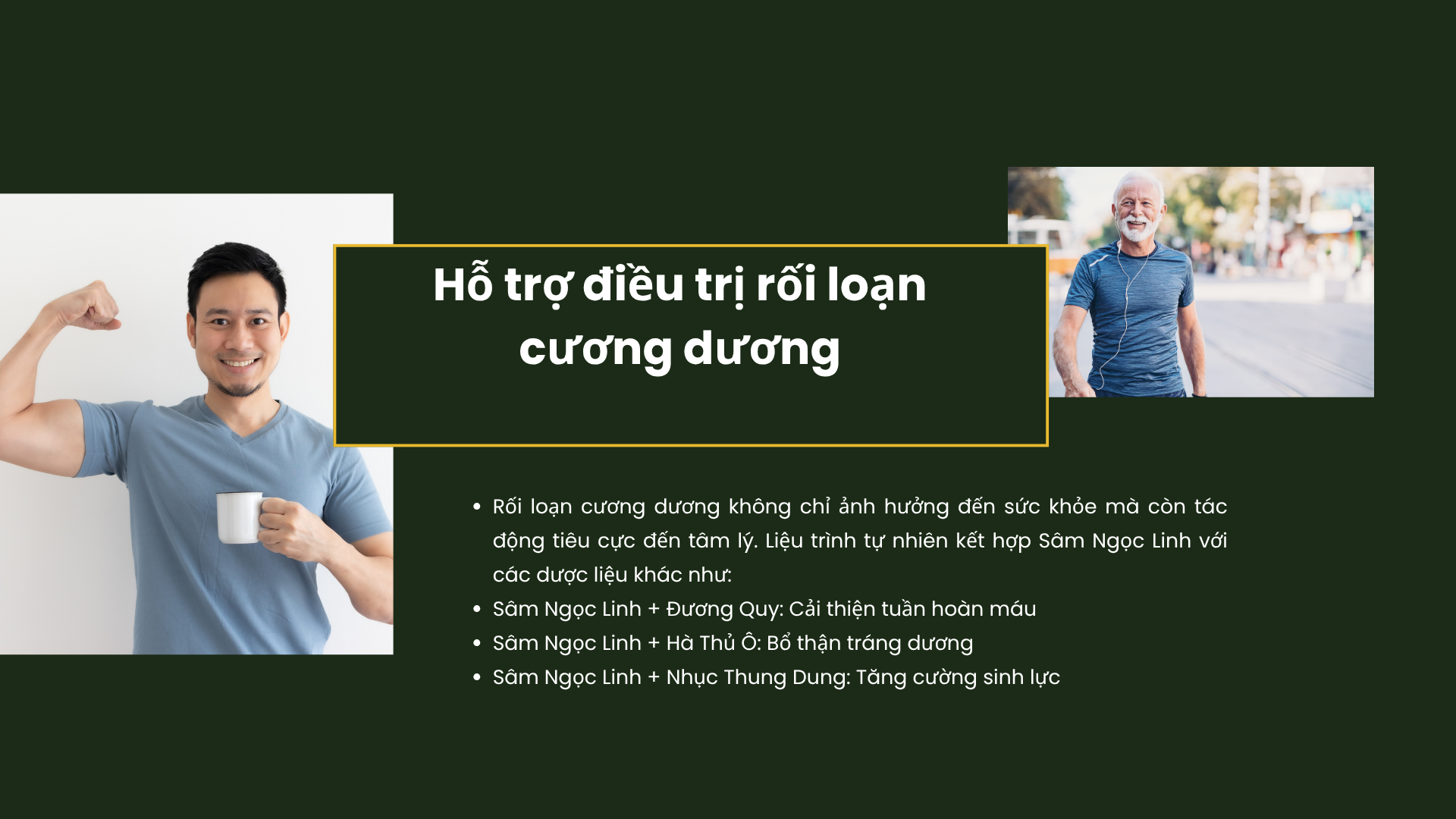 Rối loạn cương dương không chỉ ảnh hưởng đến sức khỏe mà còn tác động tiêu cực đến tâm lý. Liệu trình tự nhiên kết hợp Sâm Ngọc Linh với các dược liệu khác như: