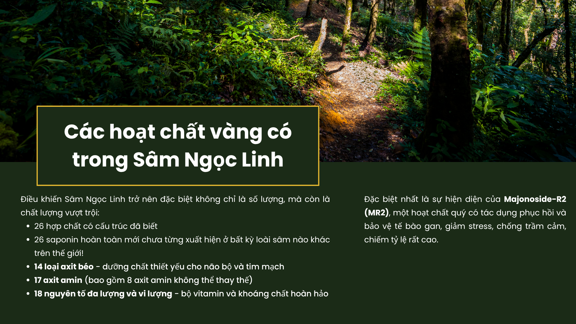 Khám phá các hoạt chất quý hiếm trong sâm Ngọc Linh như Saponin, Polysaccharide, Acid amin... Giải thích công dụng khoa học & lợi ích cho cơ thể.