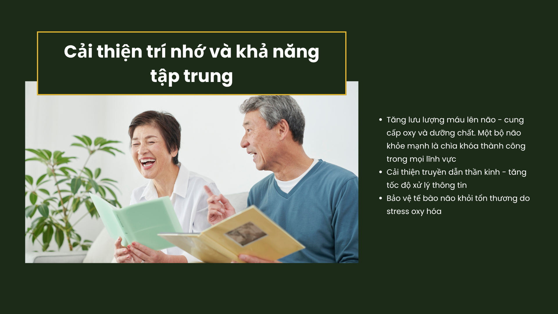 Tăng lưu lượng máu lên não - cung cấp oxy và dưỡng chất. Một bộ não khỏe mạnh là chìa khóa thành công trong mọi lĩnh vực