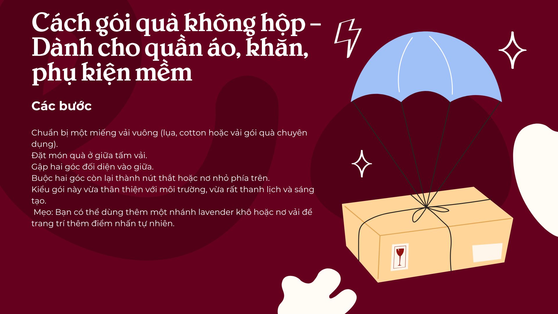 Nếu món quà của bạn không có hình dáng cố định, bạn có thể tham khảo cách gói theo phong cách Furoshiki (truyền thống Nhật Bản).