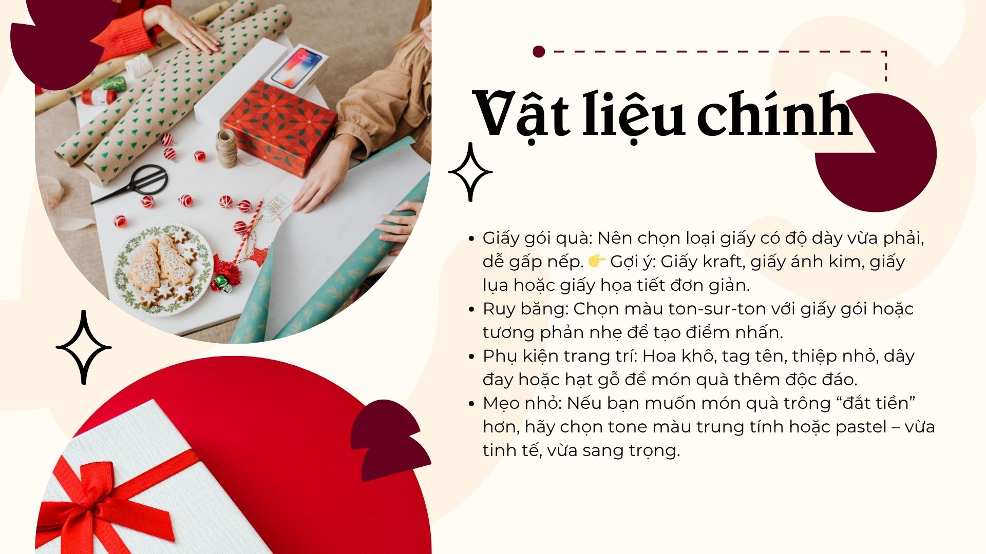 Giấy gói quà: Nên chọn loại giấy có độ dày vừa phải, dễ gấp nếp. ? Gợi ý: Giấy kraft, giấy ánh kim, giấy lụa hoặc giấy họa tiết đơn giản.