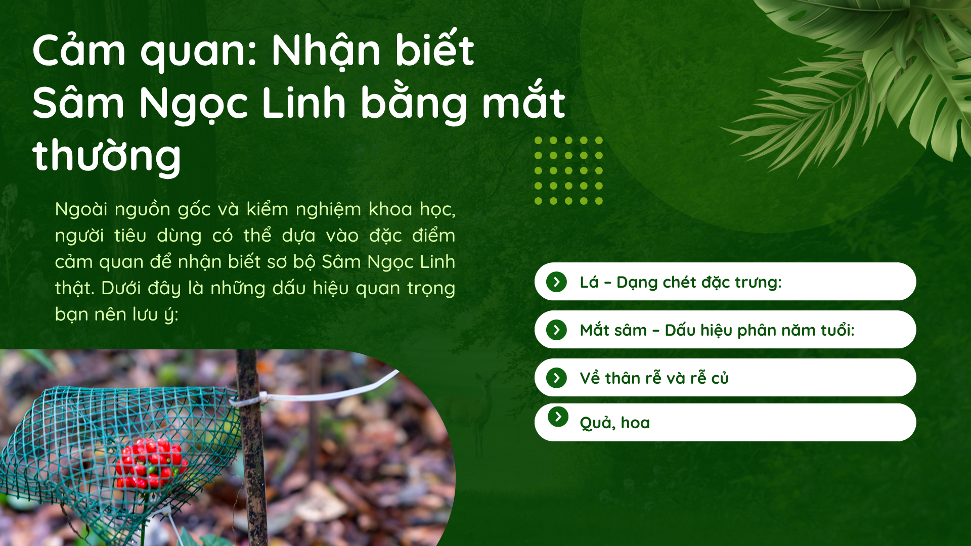 Khi kết hợp cả ba yếu tố lá – mắt sâm – thân củ – rễ củ, người tiêu dùng có thể phần nào đánh giá tính xác thực của Sâm Ngọc Linh trước khi đưa ra quyết định mua.