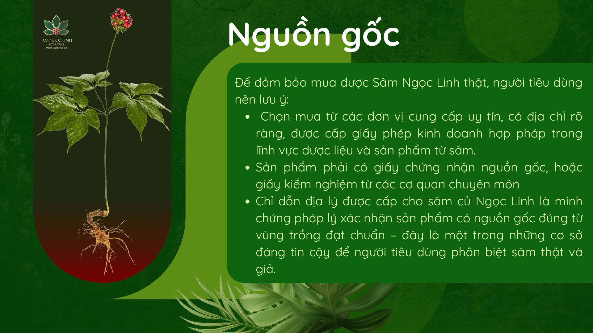 Minh bạch về nguồn gốc: Họ phải chứng minh được sản phẩm của mình đến từ các vườn sâm tại núi Ngọc Linh, có đầy đủ giấy tờ, mã truy xuất nguồn gốc (QR code) và lý tưởng nhất là giấy chứng nhận Chỉ dẫn địa lý.