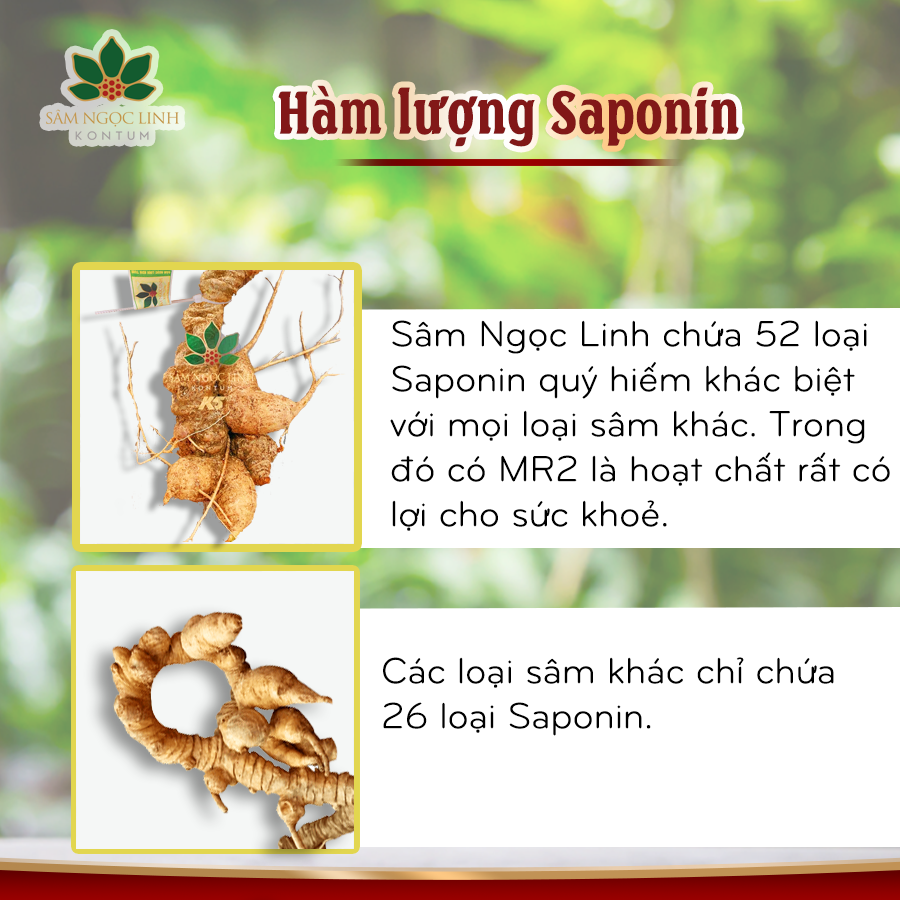 Một trong những đặc điểm nổi bật giúp phân biệt Sâm Ngọc Linh là hàm lượng saponin đặc biệt cao – lên tới hơn 50 loại saponin khác nhau, trong đó có saponin MR2 đặc trưng mà chỉ duy nhất Sâm Ngọc Linh mới có. Đây là hoạt chất quý hiếm có tác dụng vượt trội trong hỗ trợ tăng cường miễn dịch, phòng ngừa ung thư và nâng cao sức khỏe tổng thể.