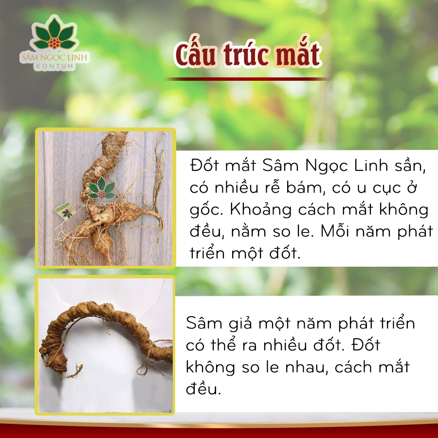 Vị trí: Các mắt sâm lõm vào thân củ một cách tự nhiên, không tròn đều và đặc biệt là mọc so le với nhau, giống như các đốt của thân cây tre, trúc.