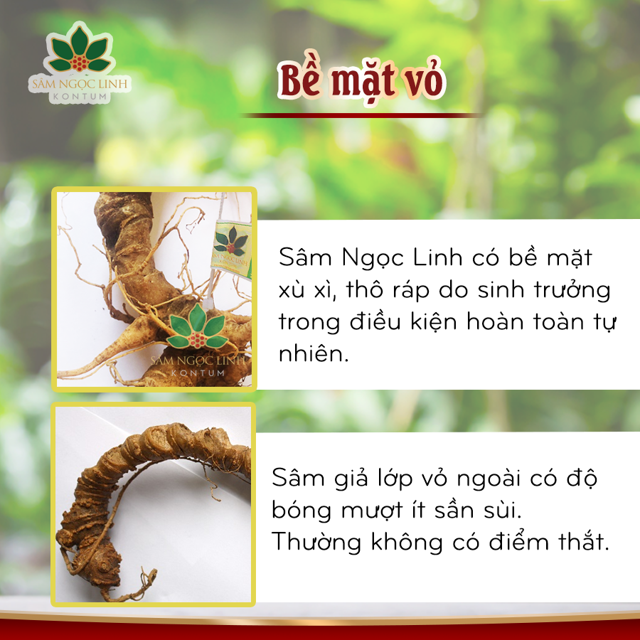 Vỏ: Vỏ sâm thật rất mỏng và mịn, không hề sần sùi thô ráp. Khi rửa sạch đất cát, củ sẽ lộ ra lớp vỏ màu vàng nâu hoặc đôi khi là màu xanh xám. Trong khi vỏ Sâm Ngọc Linh giả thì các mắt dày. Sờ vào thấy bì sần sùi, các mắt tròn, lõm, mắt mọc thẳng hàng.