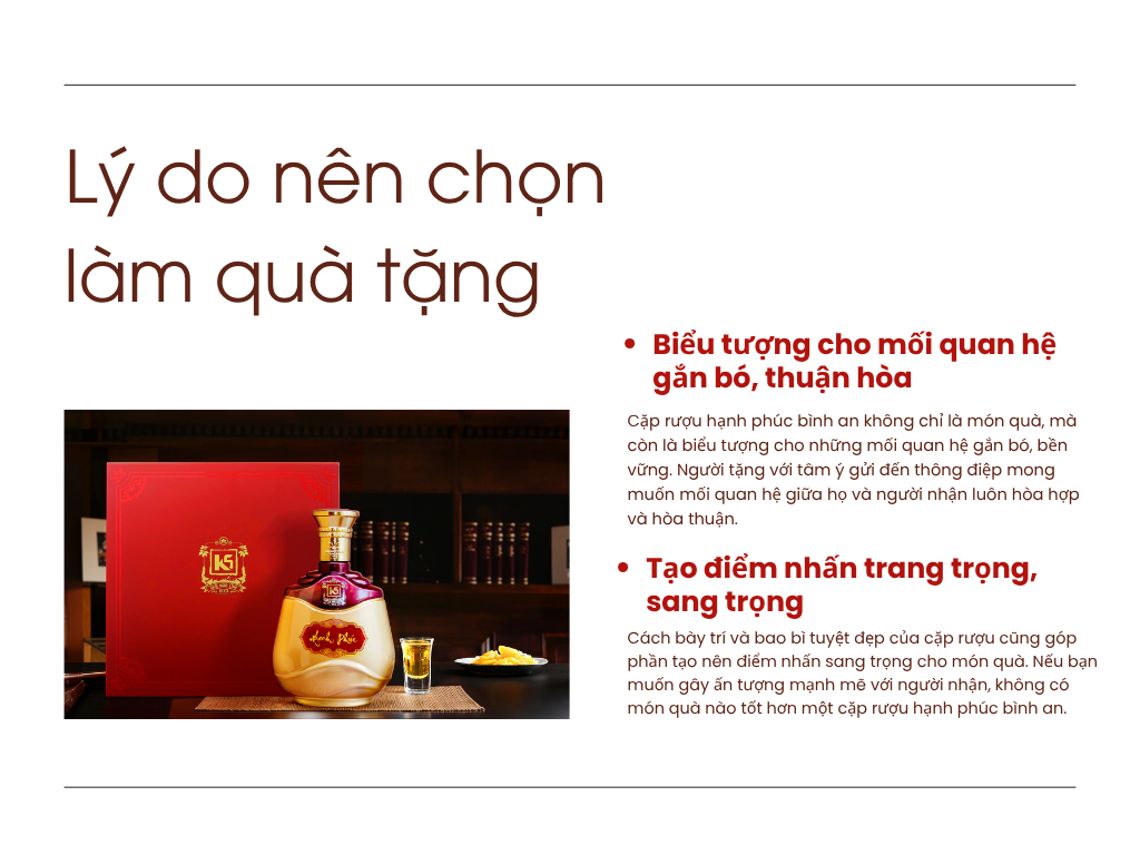 Cặp rượu hạnh phúc bình an không chỉ là món quà quý giá mà còn mang trong mình những thông điệp tốt đẹp về tình yêu và hạnh phúc. Đây là lựa chọn hoàn hảo cho những dịp đặc biệt như cưới hỏi, tân gia hay lễ Tết.