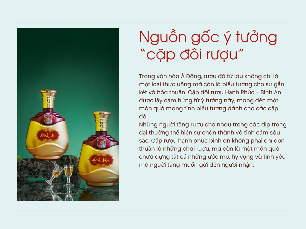 Trong văn hóa Á Đông, rượu đã từ lâu không chỉ là một loại thức uống mà còn là biểu tượng cho sự gắn kết và hòa thuận. Cặp đôi rượu Hạnh Phúc - Bình An được lấy cảm hứng từ ý tưởng này, mang đến một món quà mang tính biểu tượng dành cho các cặp đôi.