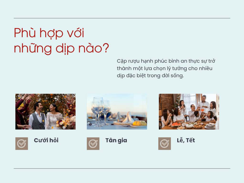 Cặp rượu "hạnh phúc bình an" thật sự là một sự lựa chọn lý tưởng cho rất nhiều dịp đặc biệt trong cuộc sống của mỗi người. Từ những bữa tiệc vui vẻ như tổ chức đám cưới, lễ tân gia cho đến các lễ hội truyền thống trong dịp Tết, tất cả những khoảnh khắc này đều có thể làm cho những người nhận cảm thấy vô cùng quý giá và đặc biệt.