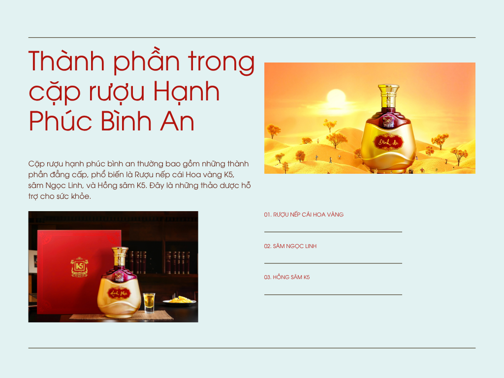 Cặp rượu hạnh phúc bình an thường bao gồm những thành phần đẳng cấp, phổ biến là Rượu nếp cái Hoa vàng K5, sâm Ngọc Linh, và Hồng sâm K5. Đây là những thảo dược hỗ trợ cho sức khỏe.
