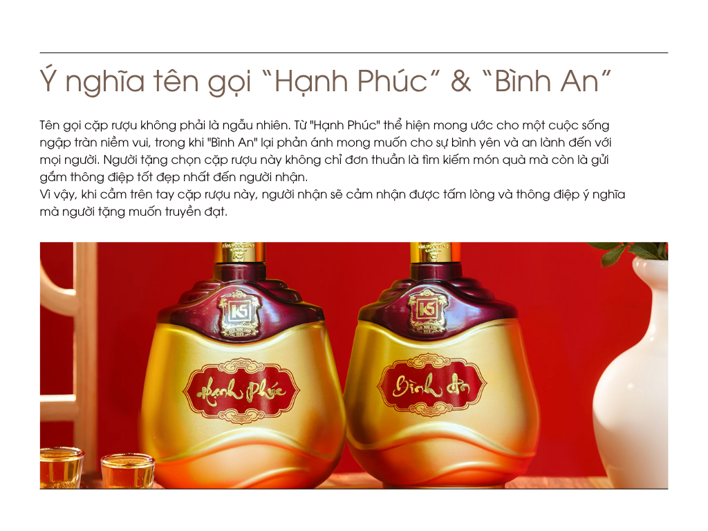 Tên gọi cặp rượu không phải là ngẫu nhiên. Từ "Hạnh Phúc" thể hiện mong ước cho một cuộc sống ngập tràn niềm vui, trong khi "Bình An" lại phản ánh mong muốn cho sự bình yên và an lành đến với mọi người. Người tặng chọn cặp rượu này không chỉ đơn thuần là tìm kiếm món quà mà còn là gửi gắm thông điệp tốt đẹp nhất đến người nhận.