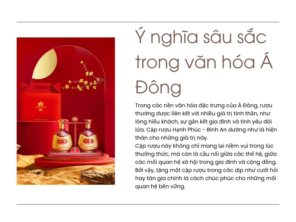 Trong các nền văn hóa đặc trưng của Á Đông, rượu thường được liên kết với nhiều giá trị tinh thần, như lòng hiếu khách, sự gắn kết gia đình và tình yêu đôi lứa. Cặp rượu Hạnh Phúc - Bình An dường như là hiện thân cho những giá trị này.