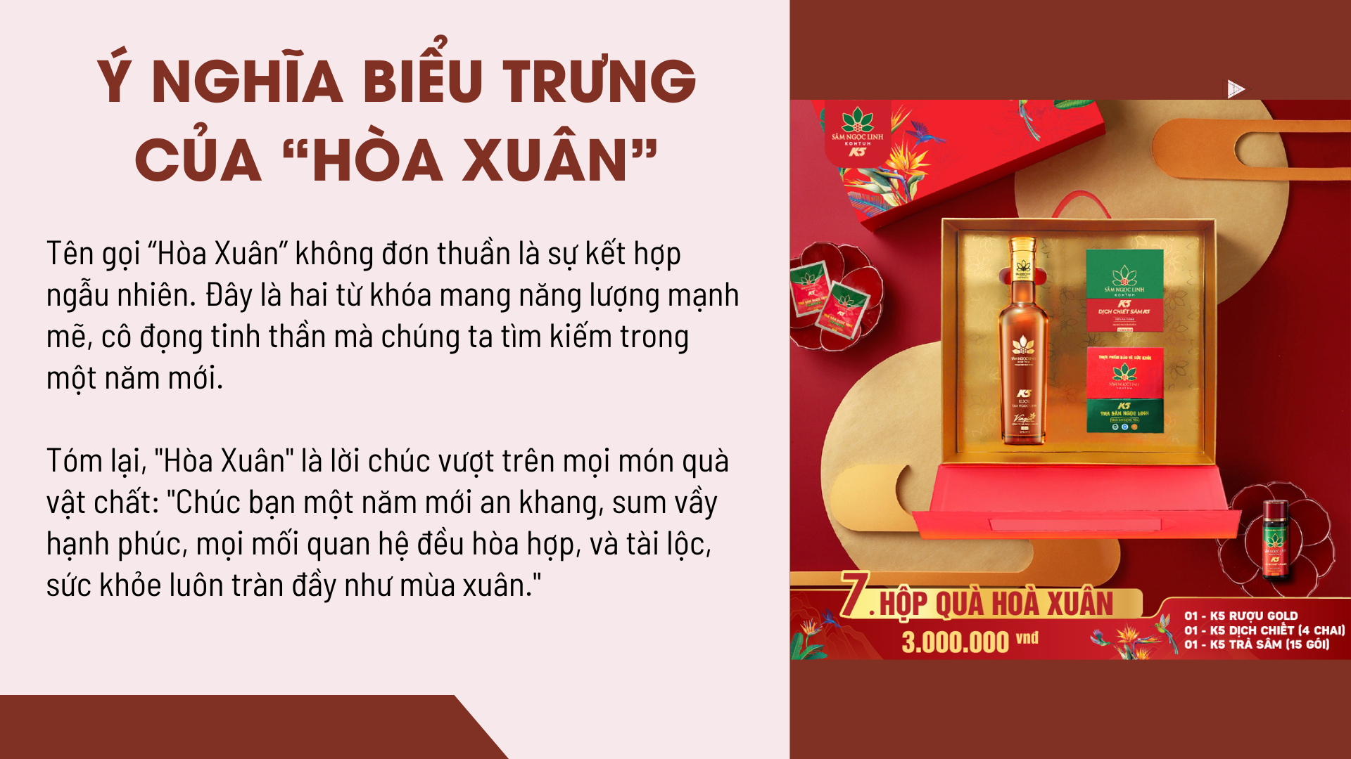 "Hòa Xuân" không chỉ là cái tên, mà là lời hứa về một mùa Tết trọn vẹn. Mỗi sản phẩm trong hộp quà không chỉ là tinh hoa từ Sâm Ngọc Linh, mà là một sợi dây kết nối vô hình: