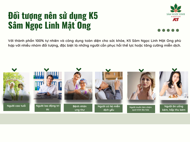 Với thành phần 100% tự nhiên và công dụng toàn diện cho sức khỏe, K5 Sâm Ngọc Linh Mật Ong phù hợp với nhiều nhóm đối tượng, đặc biệt là những người cần phục hồi thể lực hoặc tăng cường miễn dịch.