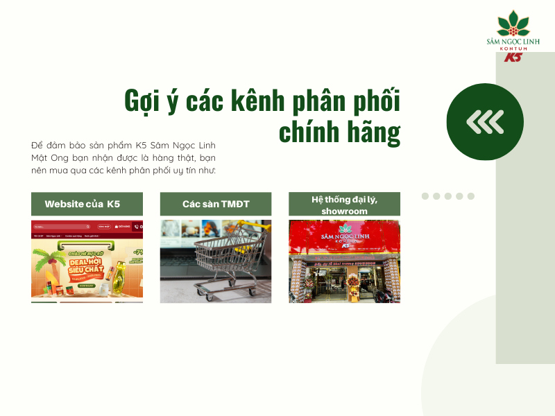 Để đảm bảo sản phẩm K5 Sâm Ngọc Linh Mật Ong bạn nhận được là hàng thật, bạn nên mua qua các kênh phân phối uy tín như:
