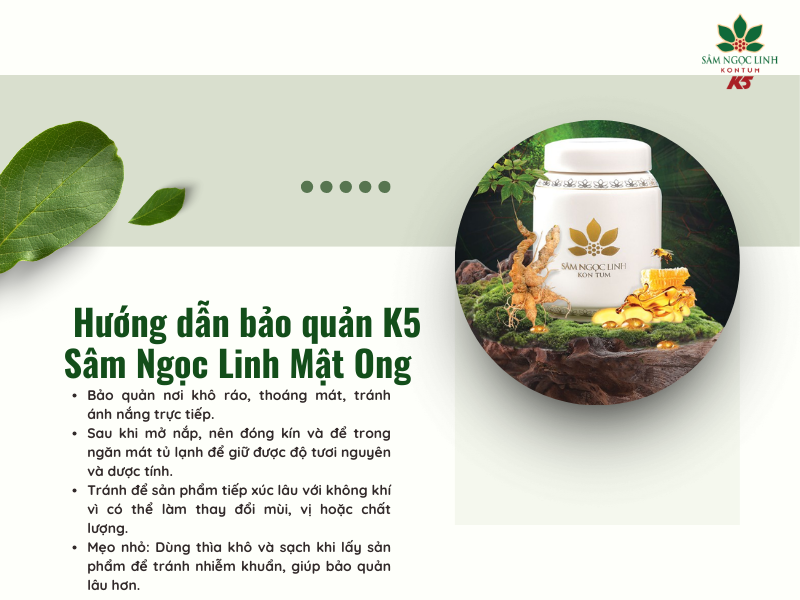 K5 Sâm Ngọc Linh Mật Ong không pha tạp, không chất bảo quản, sử dụng Sâm Ngọc Linh thật trồng tại Kon Tum và mật ong rừng nguyên sinh Tây Nguyên.