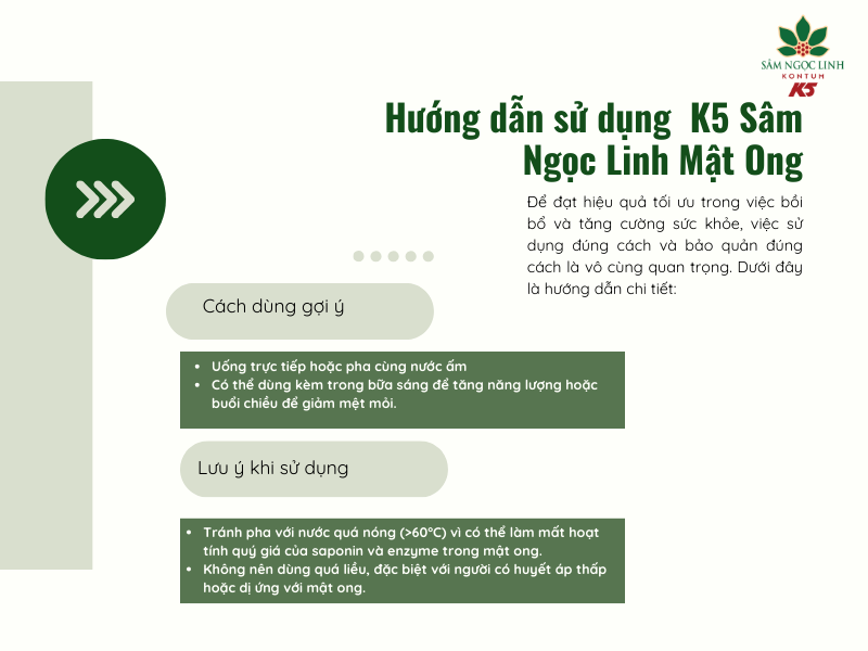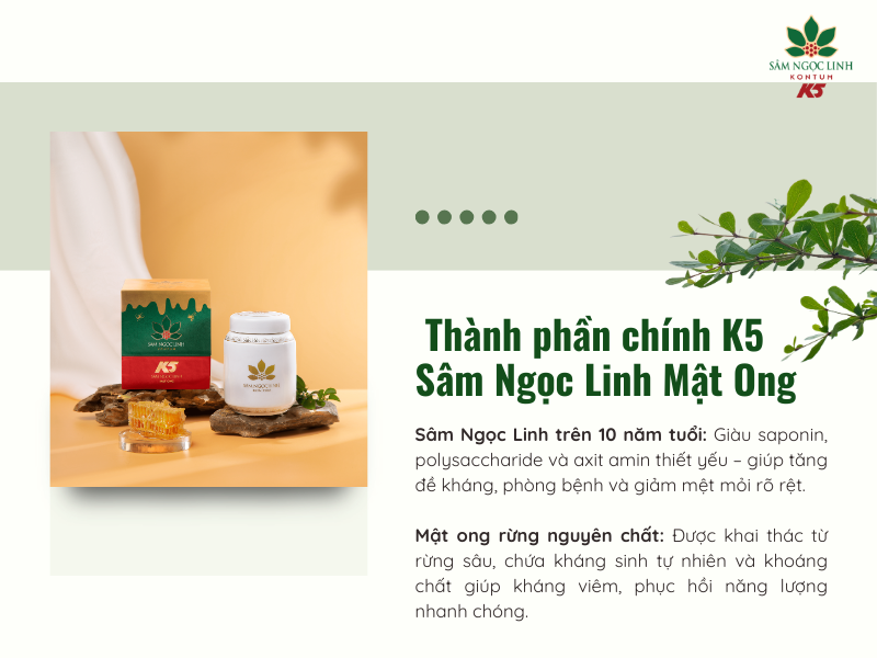 K5 Sâm Ngọc Linh Mật Ong kết hợp theo tỷ lệ vàng giữa Sâm Ngọc Linh đã xử lý sơ chế dược lý với mật ong sống chưa qua nhiệt, giúp tăng khả năng hấp thụ hoạt chất lên gấp 2–3 lần.