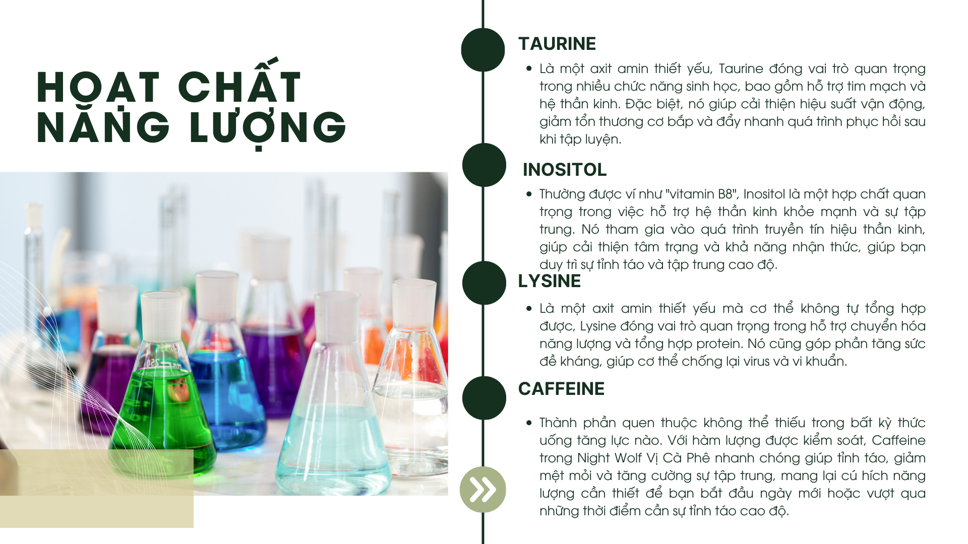 Bên cạnh các thảo dược, Night Wolf vị cà phê còn được bổ sung các hoạt chất năng lượng quen thuộc nhưng với liều lượng cân bằng, tối ưu hóa hiệu quả mà vẫn đảm bảo an toàn: