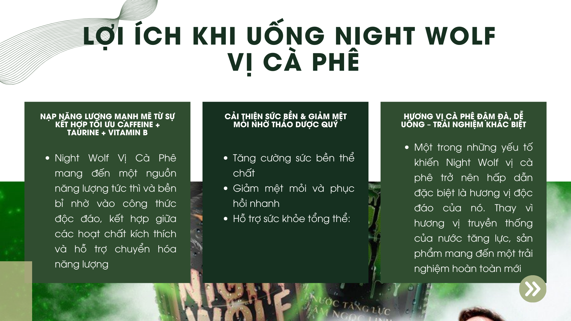 Không chỉ là thức uống tăng lực thông thường, Night Wolf Cà Phê là sự kết hợp tinh túy của các loại thảo dược quý hiếm cùng hoạt chất năng lượng được chọn lọc kỹ lưỡng, hứa hẹn sẽ "đánh thức" mọi giác quan và mang lại cho bạn sự tập trung đỉnh cao, bất kể ngày dài. Đã đến lúc tạm biệt những cơn mệt mỏi, và cùng Night Wolf Cà Phê viết nên câu chuyện về năng lượng tràn đầy, dẻo dai và đầy cảm hứng!