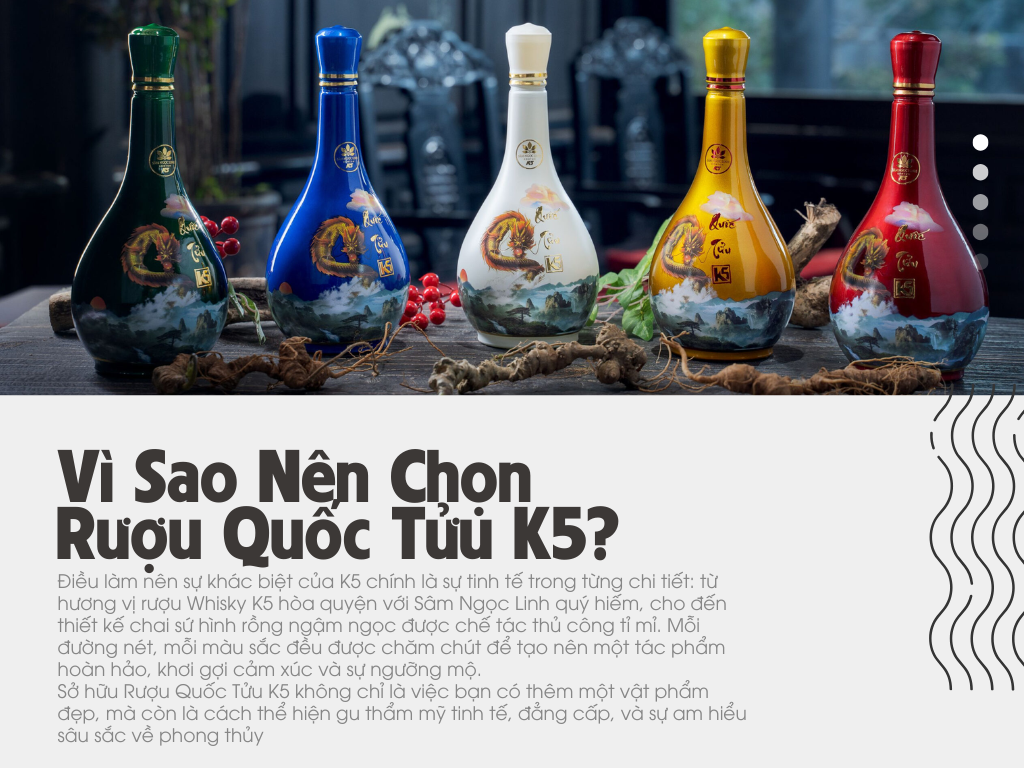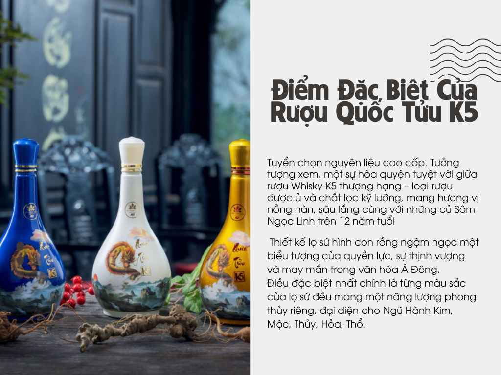 Điều làm nên sự khác biệt của K5 chính là sự tinh tế trong từng chi tiết: từ hương vị rượu Whisky K5 hòa quyện với Sâm Ngọc Linh quý hiếm, cho đến thiết kế chai sứ hình rồng ngậm ngọc được chế tác thủ công tỉ mỉ. Mỗi đường nét, mỗi màu sắc đều được chăm chút để tạo nên một tác phẩm hoàn hảo, khơi gợi cảm xúc và sự ngưỡng mộ.
