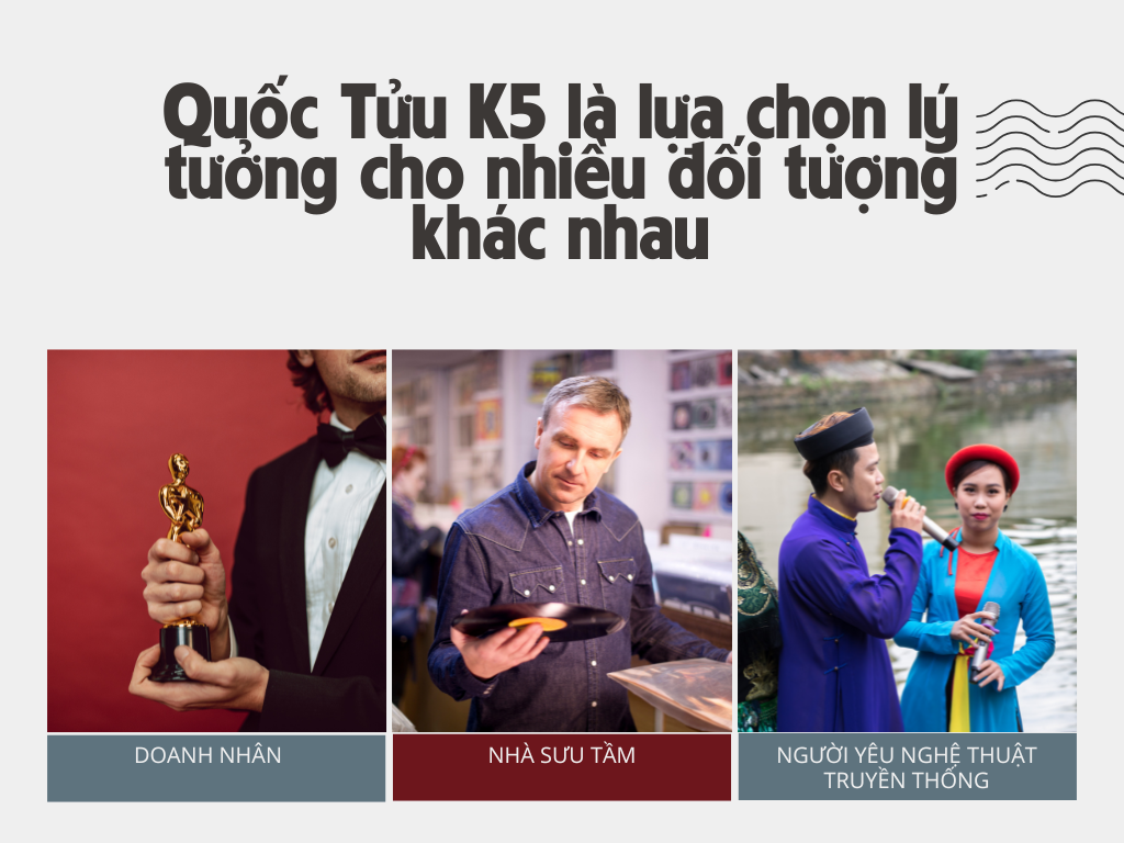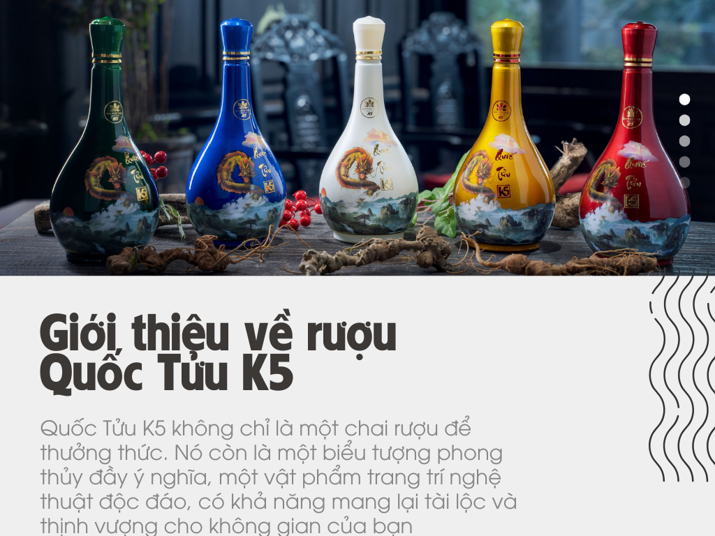 Cái tên "Quốc Tửu" đã nói lên tất cả: đây không chỉ là chai rượu bình thường mà là dòng rượu mang dấu ấn quốc gia, thường được dùng trong những sự kiện trọng đại, nơi những tinh hoa văn hóa Việt được tôn vinh. Mỗi giọt K5 đều chứa đựng sự tự hào và đẳng cấp, xứng tầm một "quốc bảo".