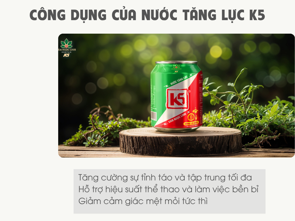 Với K5, bạn không chỉ được tăng cường năng lượng mà còn nhận được những lợi ích tuyệt vời từ Sâm Ngọc Linh như bồi bổ sức khỏe, tăng cường sức đề kháng, chống oxy hóa mạnh mẽ và giảm căng thẳng.