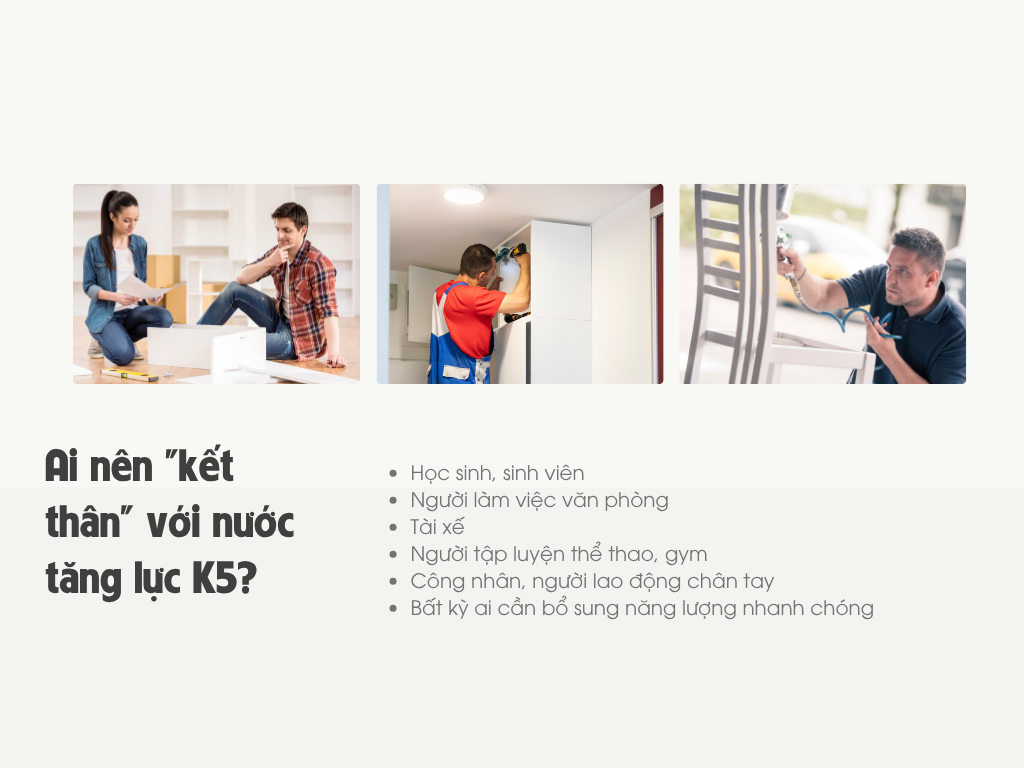 Bất kỳ ai cần bổ sung năng lượng nhanh chóng: Dù bạn đang mệt mỏi sau một chuyến đi dài, hay cần tỉnh táo cho một cuộc họp quan trọng, K5 đều có thể hỗ trợ bạn.