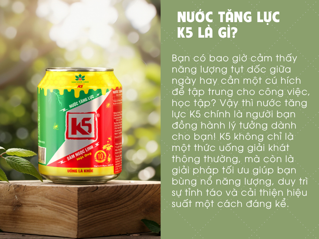 Không lạm dụng: K5 cung cấp năng lượng nhanh, nhưng không nên thay thế cho giấc ngủ hoặc chế độ dinh dưỡng khoa học. Hãy dùng K5 khi bạn thực sự cần một "liều" năng lượng bổ sung.