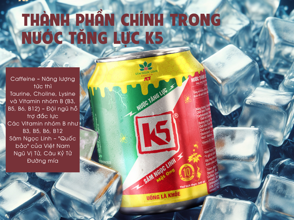 Tất cả những thành phần này được kết hợp một cách khoa học, tạo nên K5 – một thức uống tăng lực không chỉ giúp bạn tỉnh táo mà còn là người bạn đồng hành chăm sóc sức khỏe. Bạn đã sẵn sàng trải nghiệm sự khác biệt chưa?