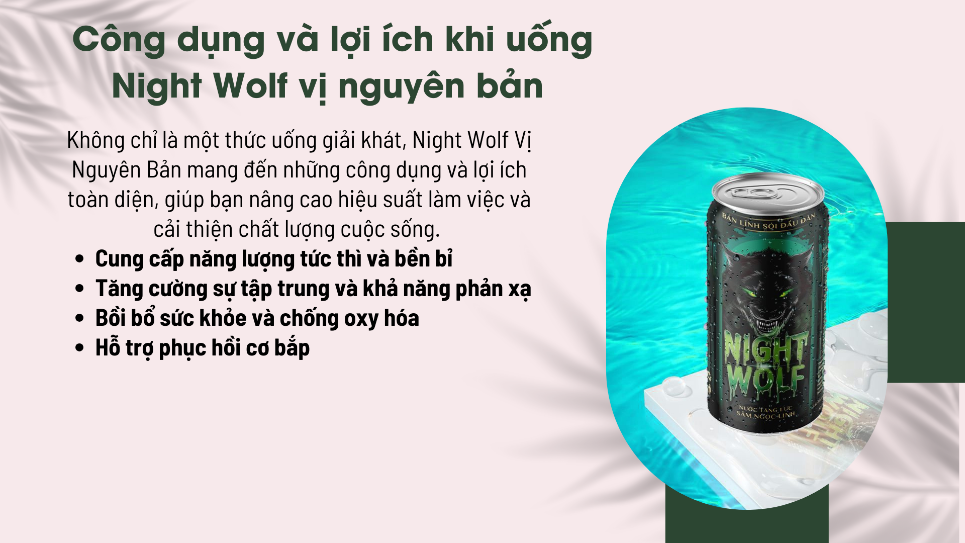 Night Wolf không chỉ giúp bạn tỉnh táo tức thì, mà còn nuôi dưỡng sức khỏe từ sâu bên trong, giúp bạn bứt phá mọi giới hạn và làm chủ cuộc chơi.