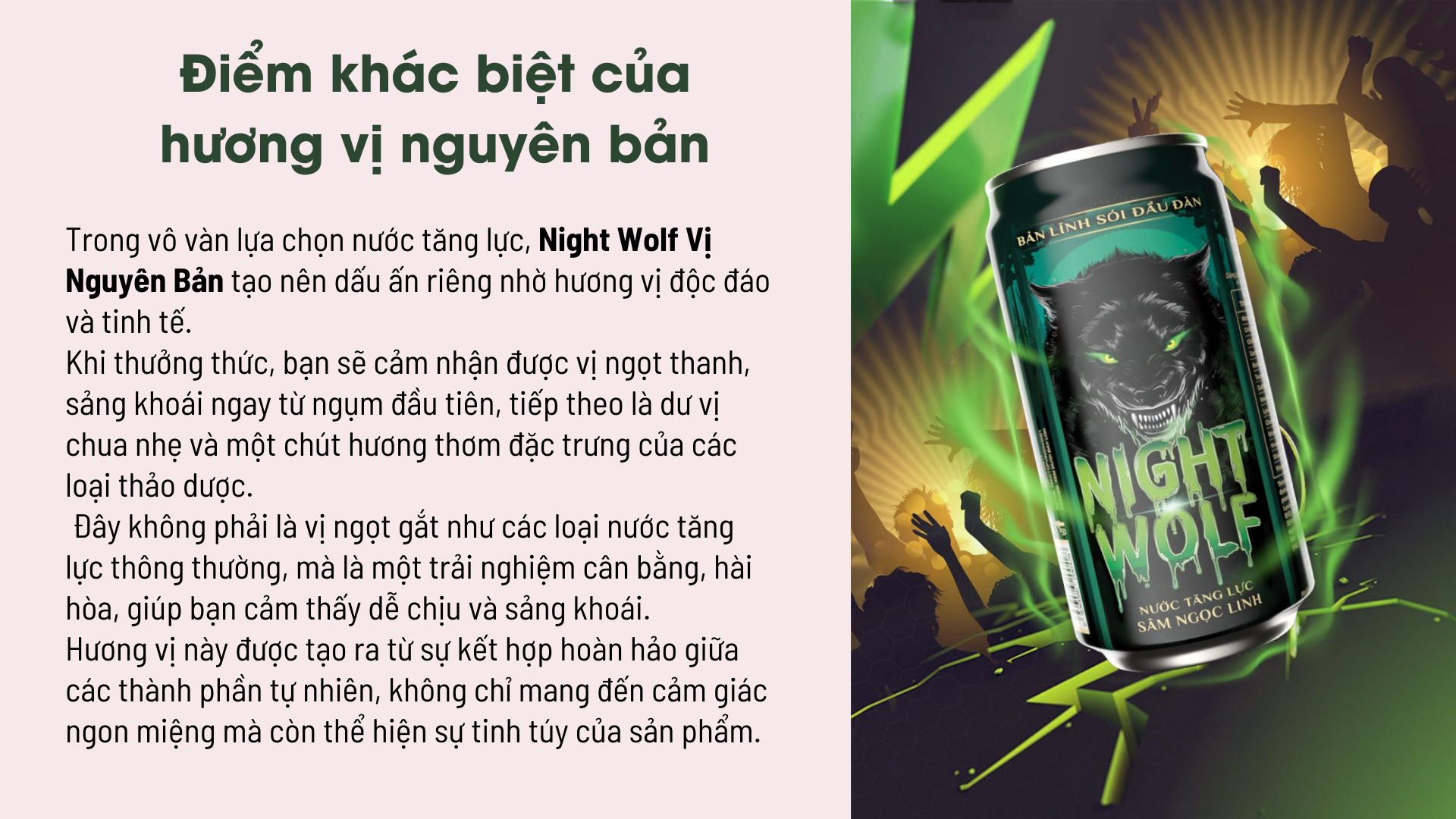 Trong vô vàn lựa chọn nước tăng lực, Night Wolf Vị Nguyên Bản tạo nên dấu ấn riêng nhờ hương vị độc đáo và tinh tế.
