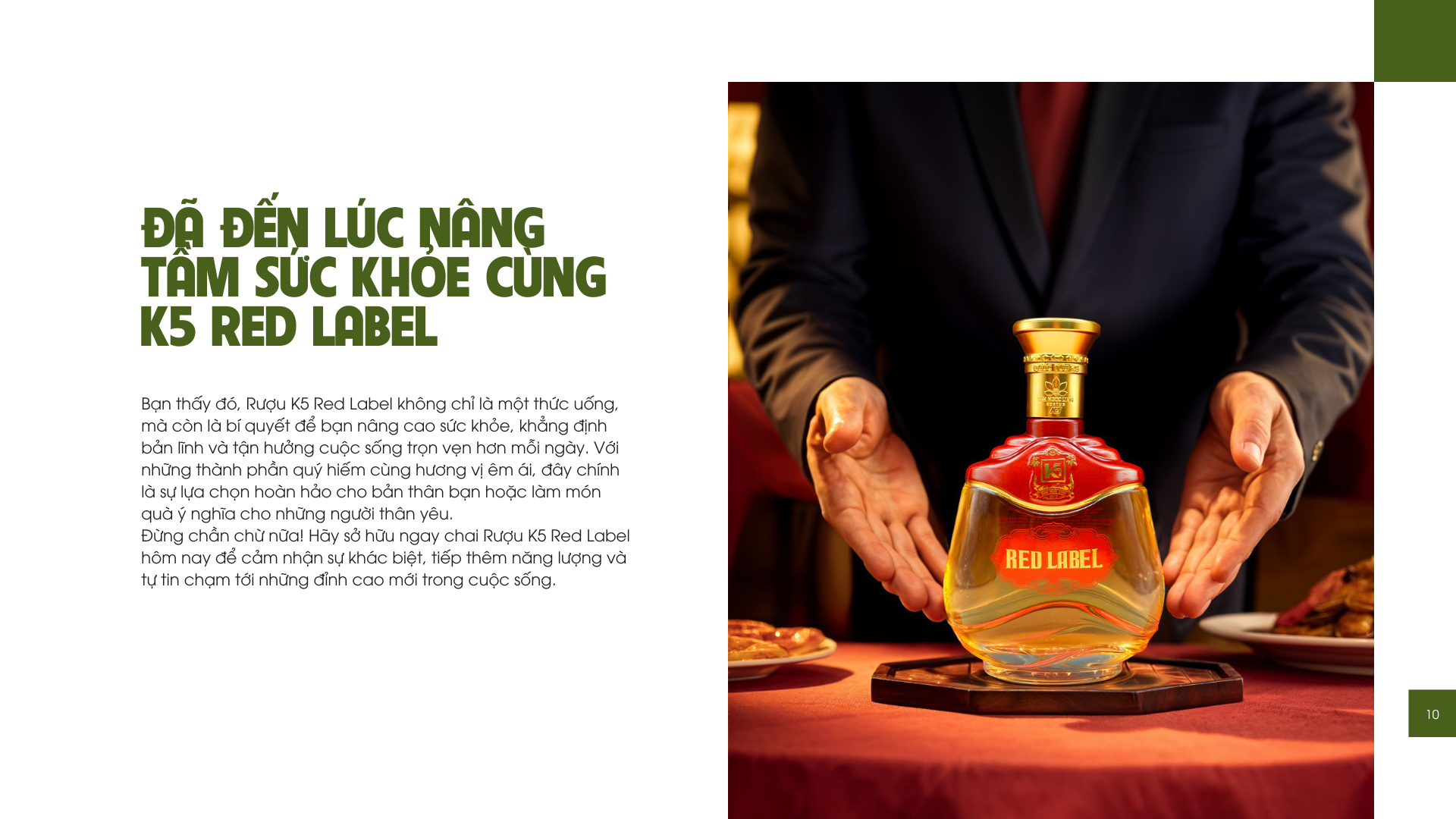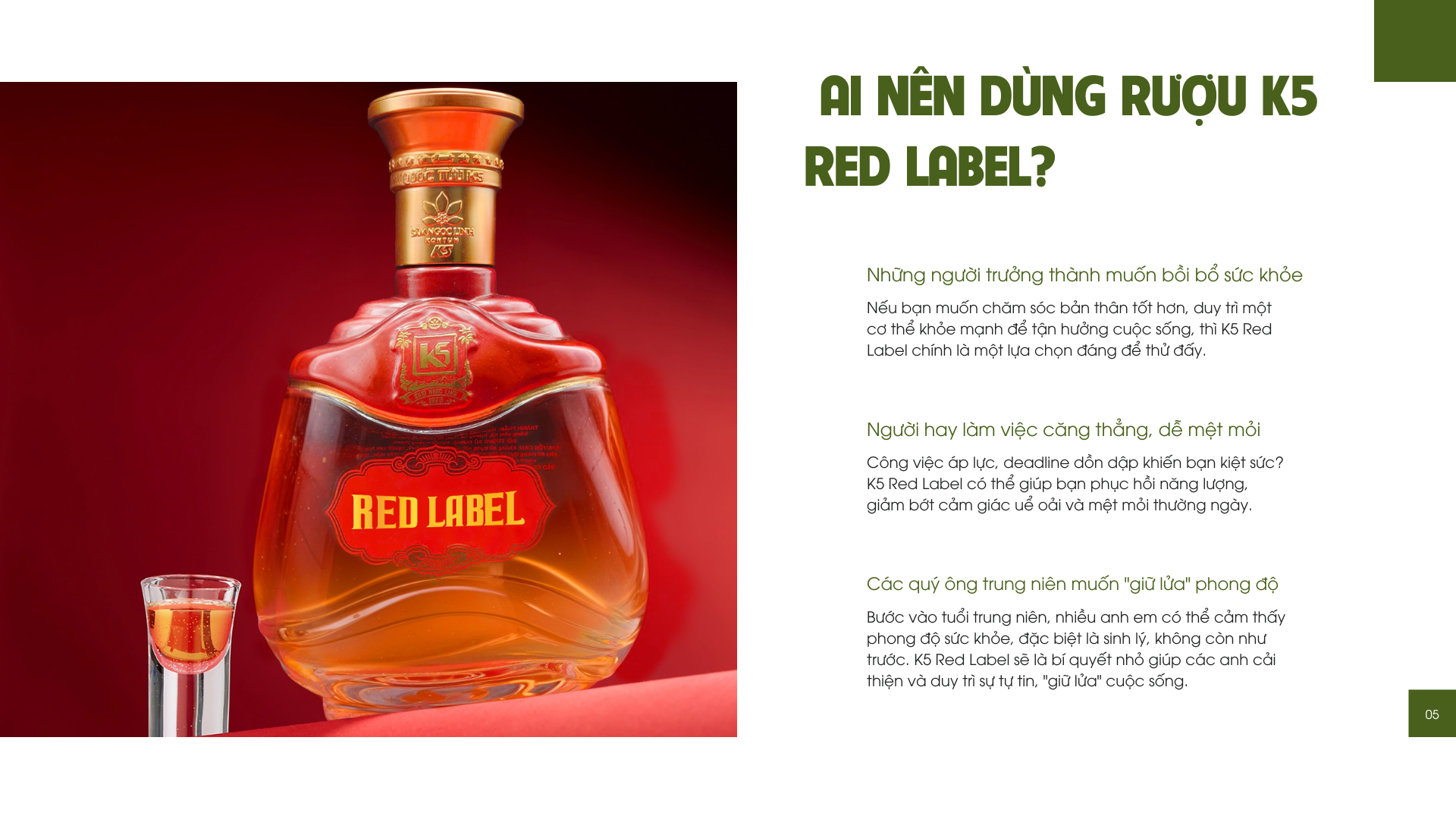 Vậy K5 Red Label dành cho ai? Thật ra, sản phẩm này rất hợp với các anh em ở độ tuổi trưởng thành muốn bồi bổ cơ thể, hoặc đơn giản là muốn tìm một thức uống có lợi cho sức khỏe. Đặc biệt, nếu bạn đang tìm kiếm một món quà thật ý nghĩa và sang trọng để biếu tặng sếp, đối tác hay những người thân yêu, K5 Red Label chắc chắn sẽ làm hài lòng mọi người đấy!