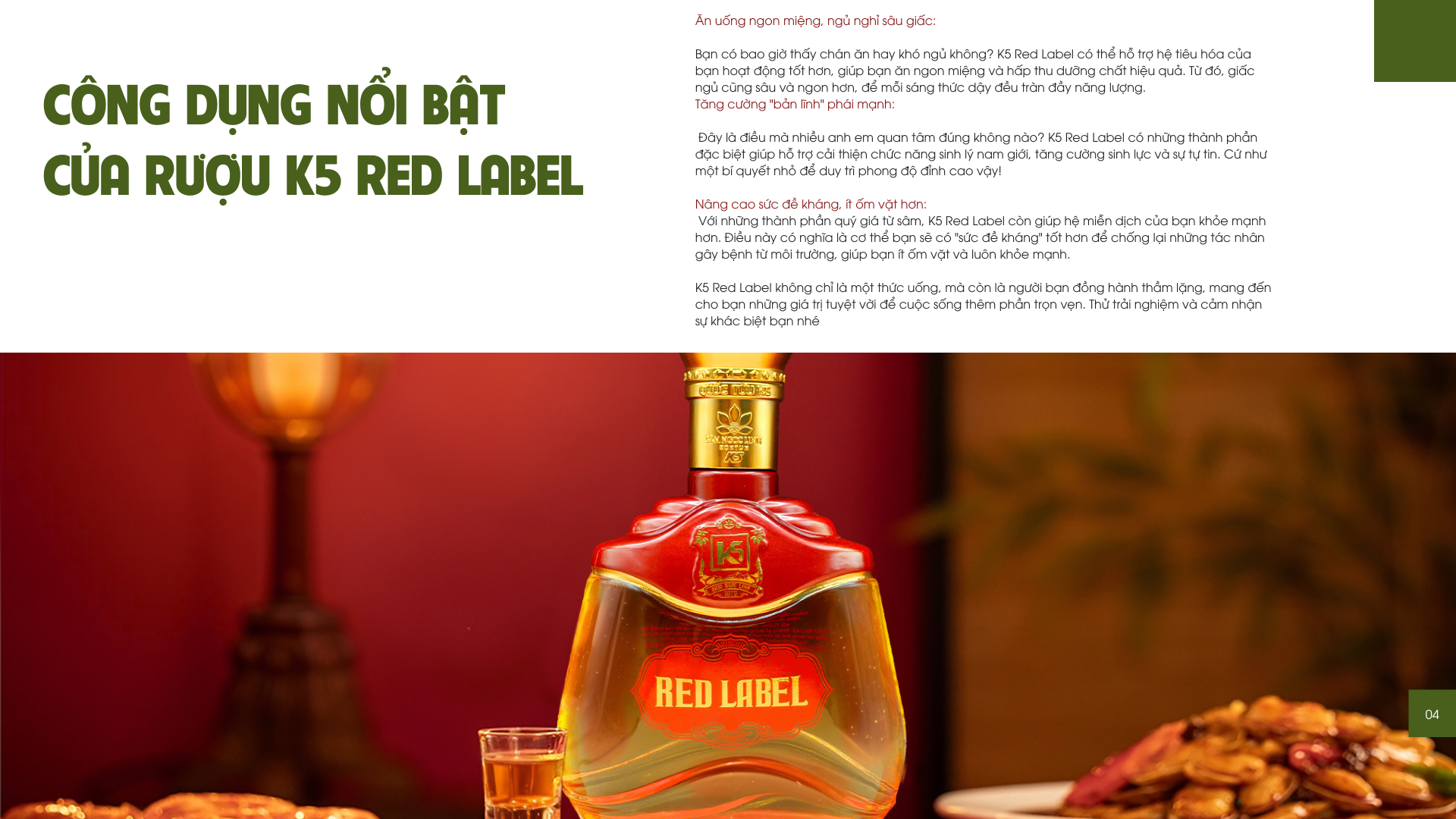 Mỗi thành phần trong K5 Red Label không chỉ là dược liệu, mà còn là nguồn cảm hứng, là lời nhắc nhở về giá trị của tự nhiên và sức mạnh tiềm ẩn bên trong mỗi chúng ta. Hãy cảm nhận và để K5 Red Label đánh thức nguồn năng lượng đó.