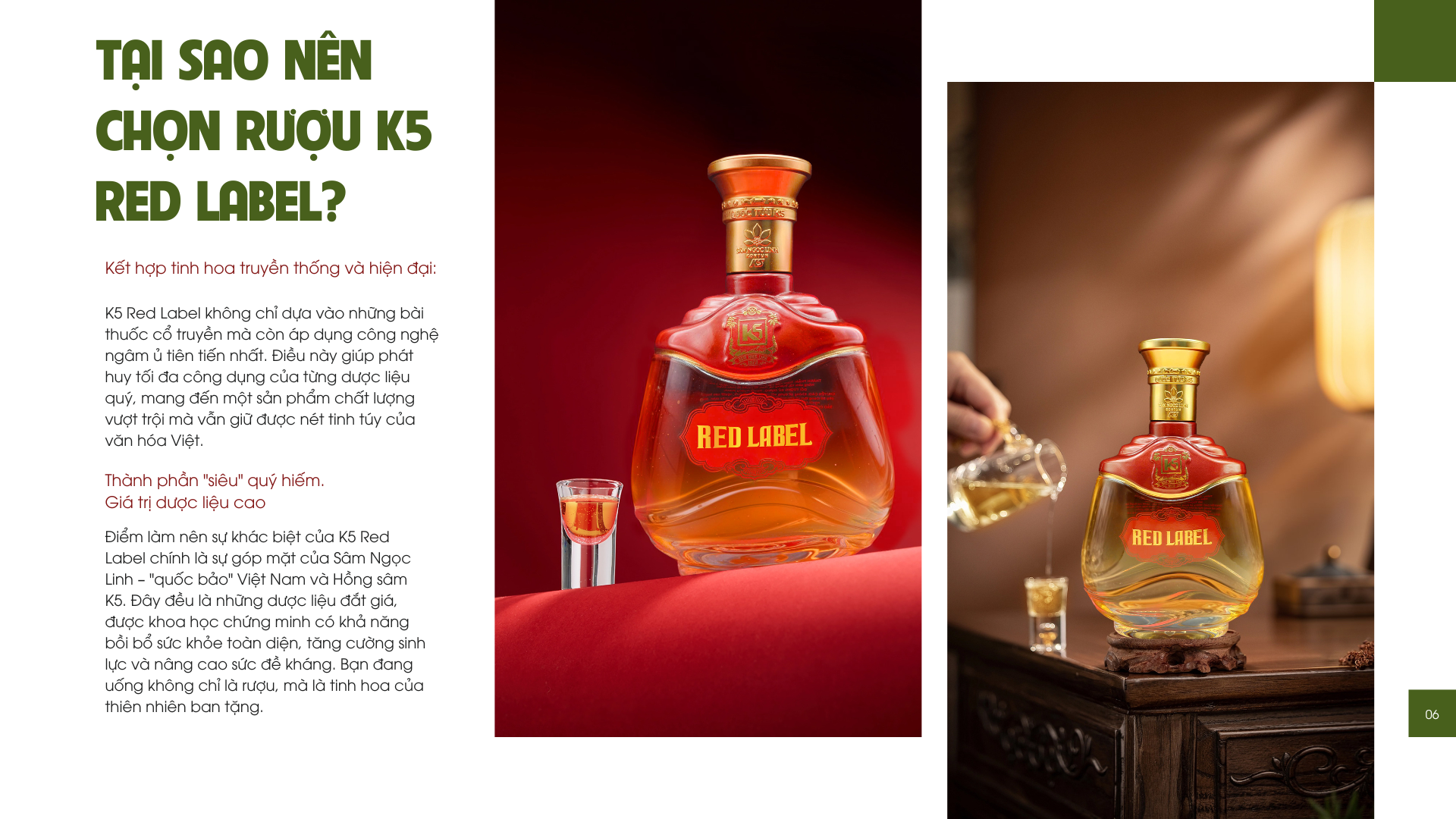Điểm làm nên sự khác biệt của K5 Red Label chính là sự góp mặt của Sâm Ngọc Linh – "quốc bảo" Việt Nam và Hồng sâm K5. Đây đều là những dược liệu đắt giá, được khoa học chứng minh có khả năng bồi bổ sức khỏe toàn diện, tăng cường sinh lực và nâng cao sức đề kháng. Bạn đang uống không chỉ là rượu, mà là tinh hoa của thiên nhiên ban tặng.