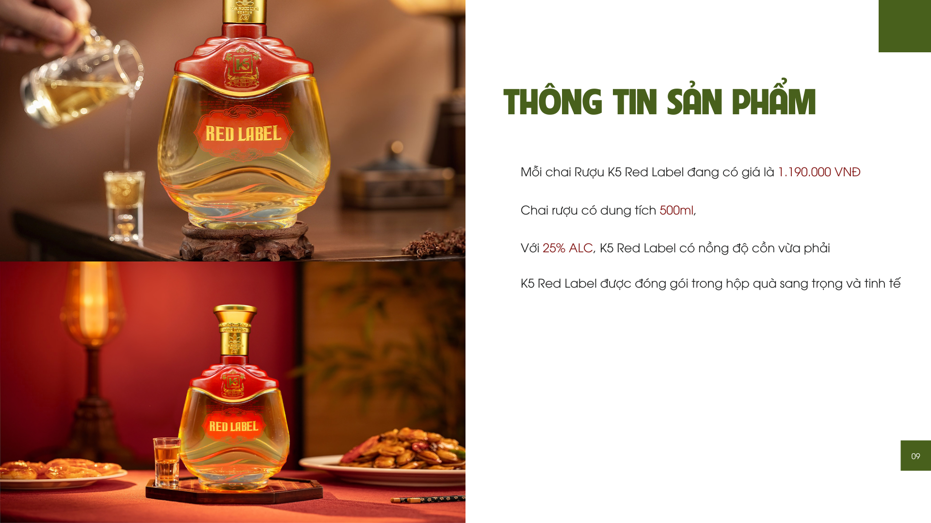 Với 25% ALC, K5 Red Label có nồng độ cồn vừa phải, đủ để phát huy công dụng của các loại thảo dược mà vẫn giữ được sự êm dịu khi thưởng thức. Bạn sẽ không cảm thấy quá gắt hay khó uống đâu nhé.