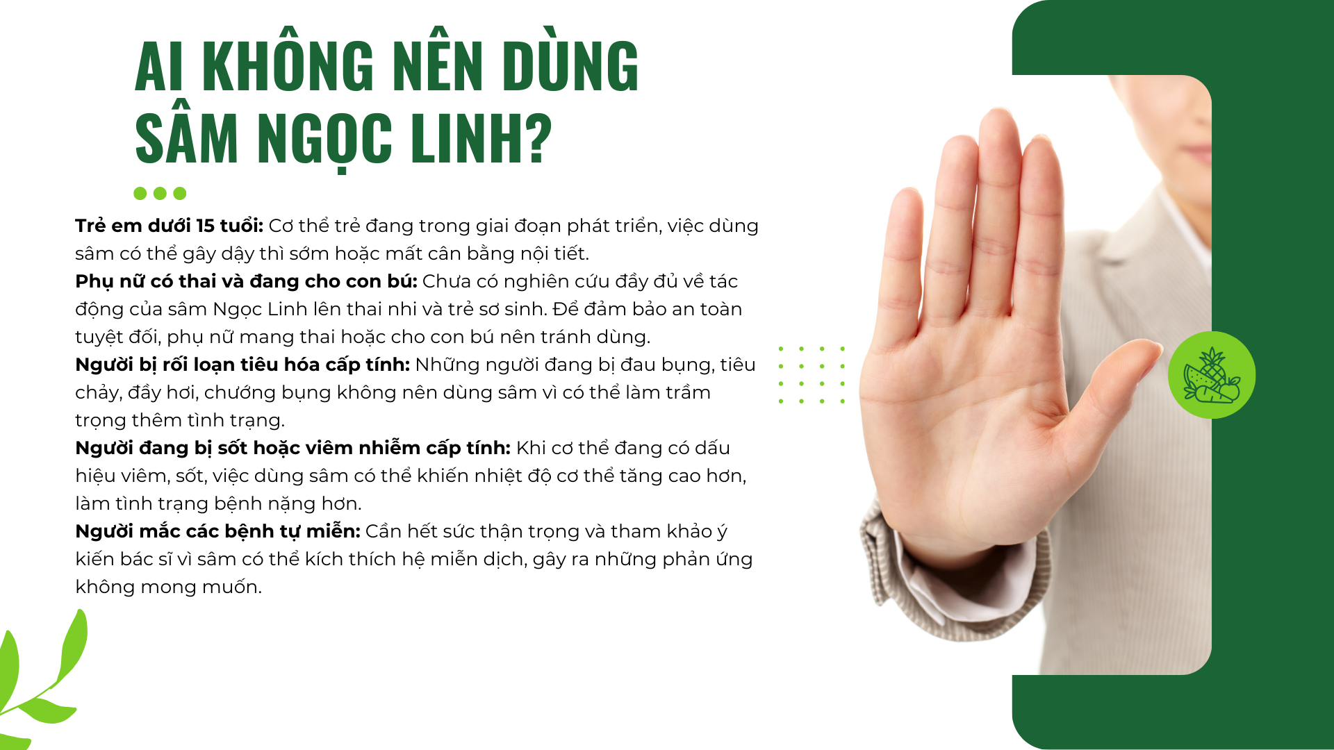 Sâm Ngọc Linh có khả năng bồi bổ mạnh mẽ và tác động sâu vào các hệ cơ quan, do đó cần tránh sử dụng cho những đối tượng sau: